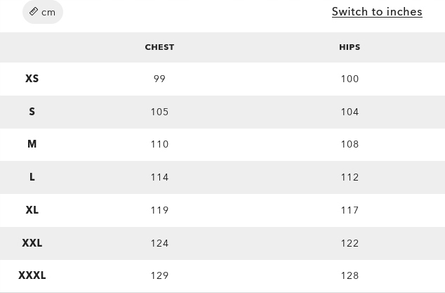 Таблица размеров ниже: (Грудная окружность грудной клетки, бедра - цепь бедра)