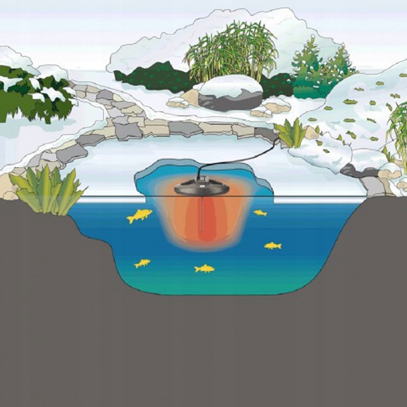 Защита пруда от замерзания: снабжает воду кислородом и позволяет выходить вредным газам брожения. Благодаря активному нагревательному элементу он также подходит для неглубоких водоемов и постоянных морозов. Вокруг плавающего тела создается зона, свободная ото льда до -20°С.