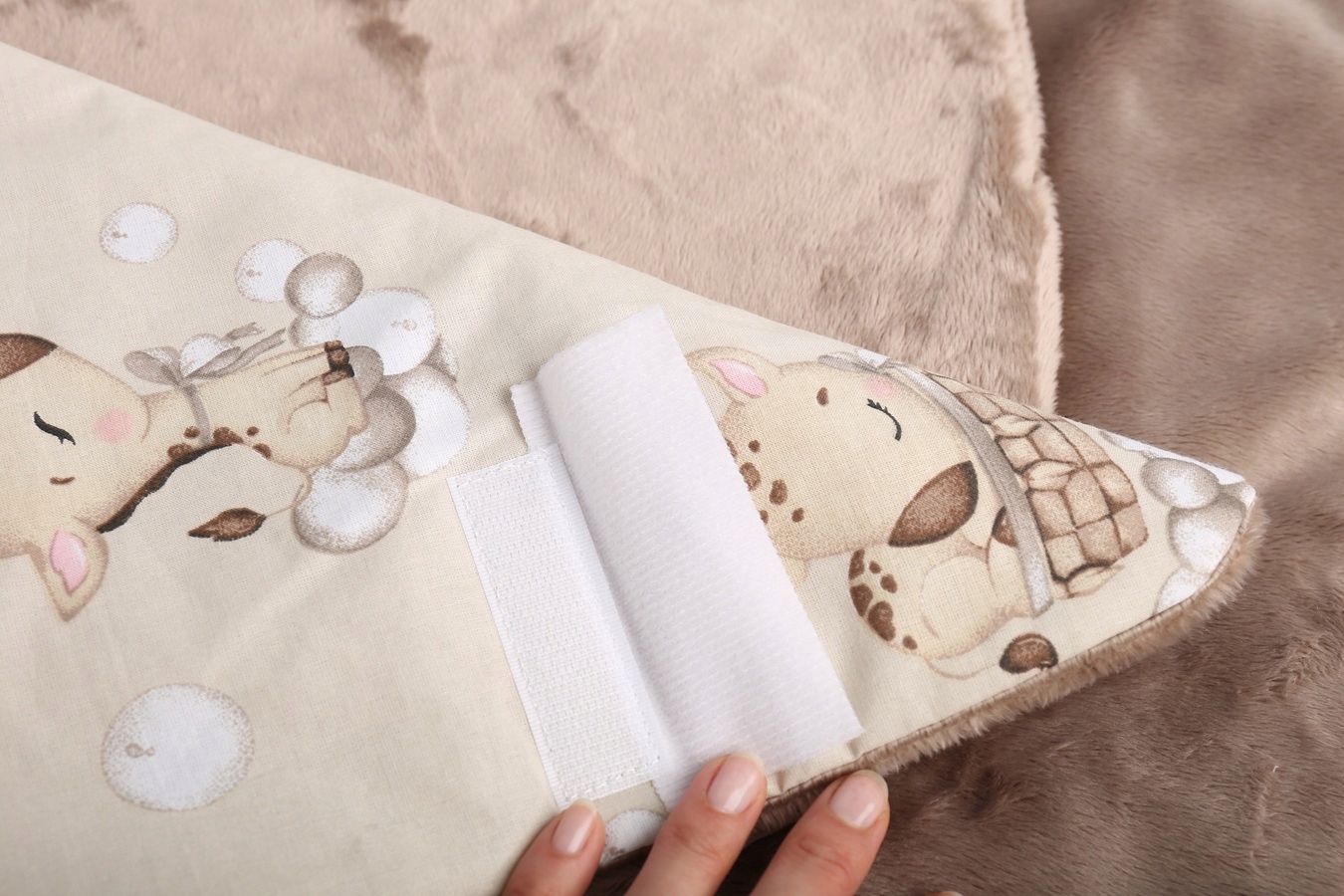 • Его конструкция: уютный плюш + антиаллергенный, стеганый наполнитель + внутри 100% хлопок - мягкий, дышащие, успокаивающие.