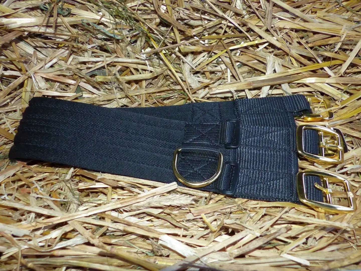 <р> Оригинальная запчасть поясного ремня. <р> Пряжки для застегивания двух палантинов с каждой стороны. <р> Золотые пряжки, черный подпояс. <р> По бокам подпруги имеются кольца для крепления вспомогательных средств верховой езды, т.е. поводьев, черного повода и т.п.Также можно использовать как обычную выездковую подпругу или подпругу для пони.