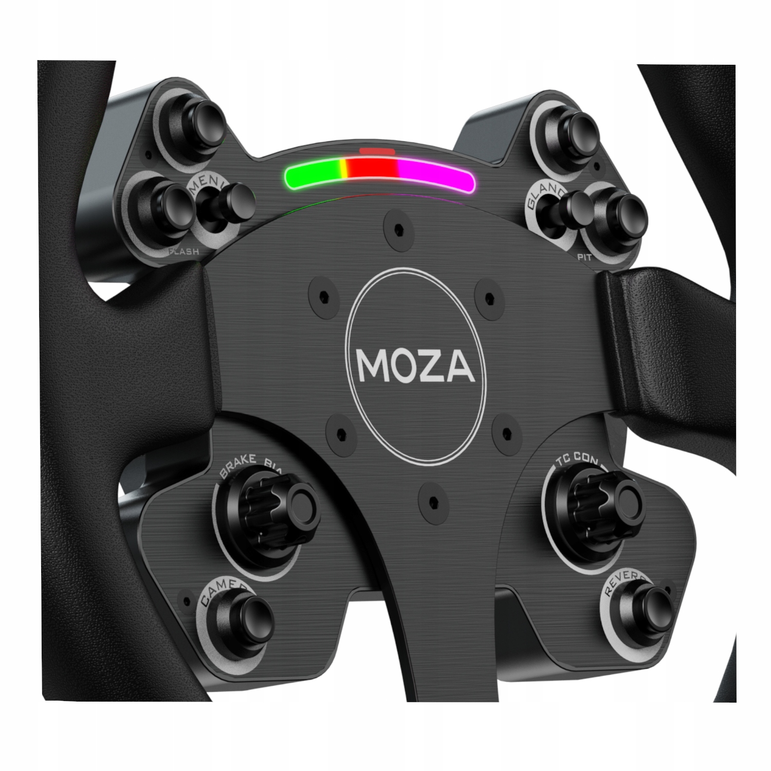 MOZA Quick Release b> Система предлагает замену обода за 2 секунды, а вся конструкция чрезвычайно жесткая и прочная, опережая в этом отношении продукцию конкурентов. Стоит упомянуть дополнительные функции, которые предлагает этот обод. У нас есть 2 потенциометра, каждый по 20 позиций, а также на ободе имеется светодиодная лента, информирующая об оборотах.