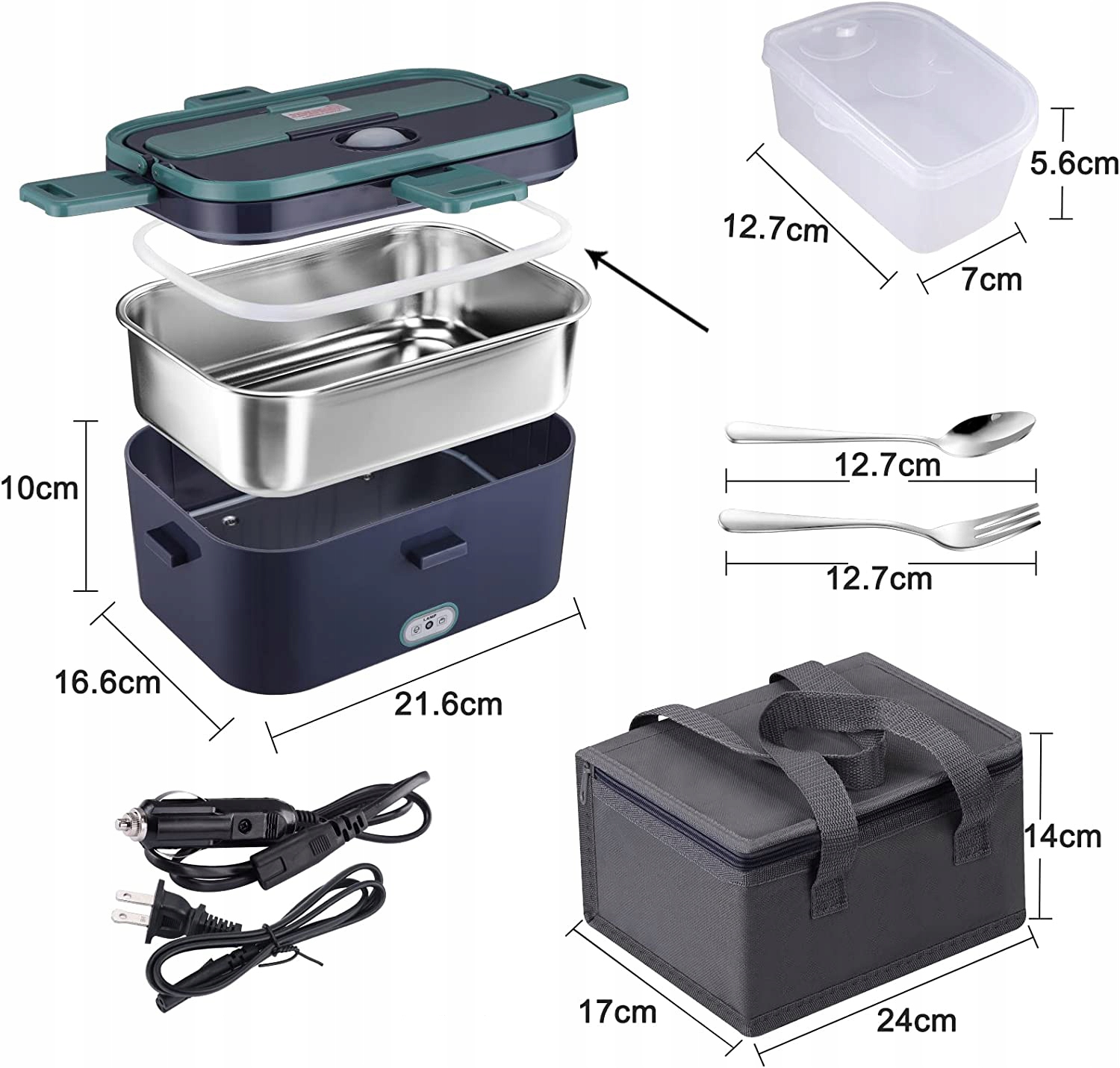 Большой стальной контейнер с большой емкостью 1,8 литра, вам не нужно быть голодным. Наша обогреваемая ланч -коробка идеально подходит для вас. Кроме того, мы предоставляем пластиковую камеру 0,45 л, так что вы можете размещать различные виды пищи отдельно. На обложке есть нож и вилка, его также можно использовать в качестве держателя мобильного телефона для просмотра фильмов во время еды.