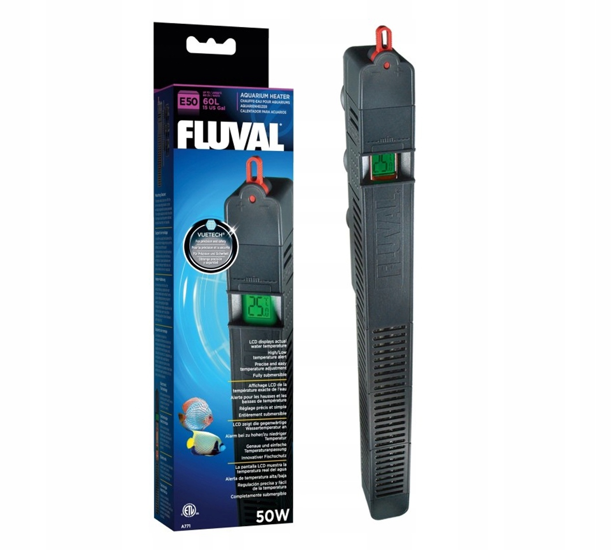 Нагреватель Hagen Fluval E50 можно полностью погружать в воду. Нагреватель оснащен дисплеем, позволяющим легко считывать температуру воды