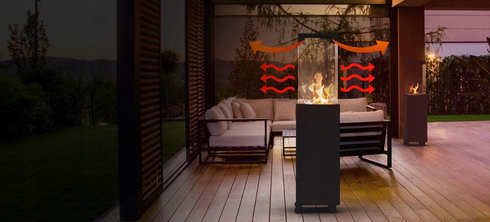 Faro имеет тепловую мощность 8 кВт. Лучше всего он работает в крытых местах, защищенных от ветра, таких как беседки и перголы. Он равномерно излучает тепло с четырех сторон через окна и отверстия в навесе.