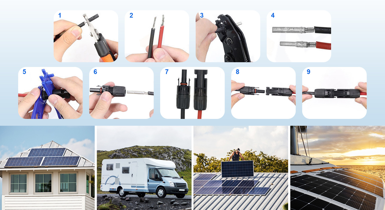 Инструмент для обжима солнечной энергии изготовлен из углеродистой стали и высоколегированной стали, а ручка изготовлена из PP + TP, разъем для солнечной батареи имеет луженую медную жилу и изолированный корпус из PPO, встроенное двойное уплотнительное кольцо кабеля и имеет превосходные водонепроницаемость, безопасность и надежность.
