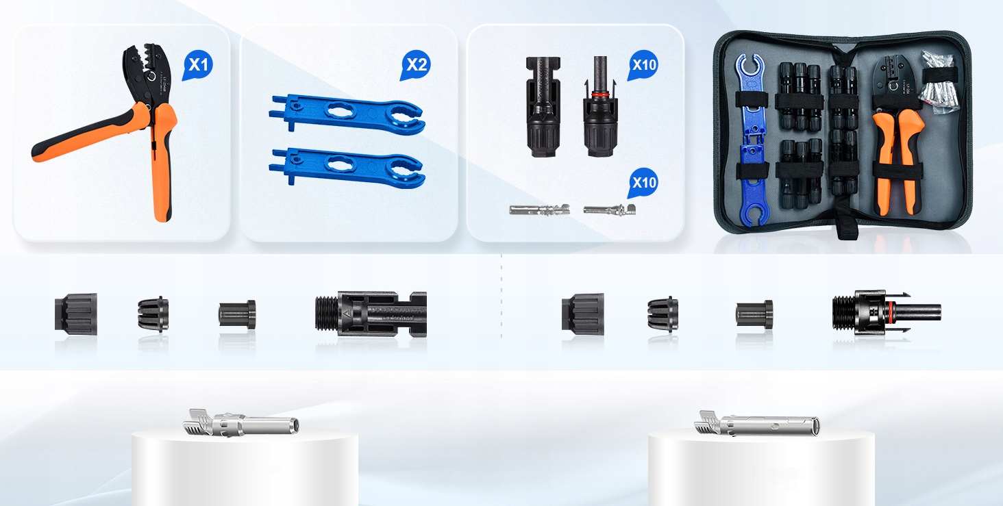 10 пар разъемов для солнечных панелей «папа» и «мама» + 10 пар контактов разъема для солнечных батарей. Корпус этого кабельного разъема изготовлен из высококачественного изоляционного материала, он защищает от поражения электрическим током, УФ-излучения, старения и пыли. Разъем водонепроницаем до уровня IP67, поэтому его можно использовать на открытом воздухе в любую погоду.