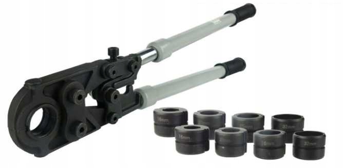 Ручной опрессовщик для обжима соединителей на трубах PEX-AL-PEX с набором из 8 матриц. Он оснащен механизмом, позволяющим точно и плотно обжимать разъемы.