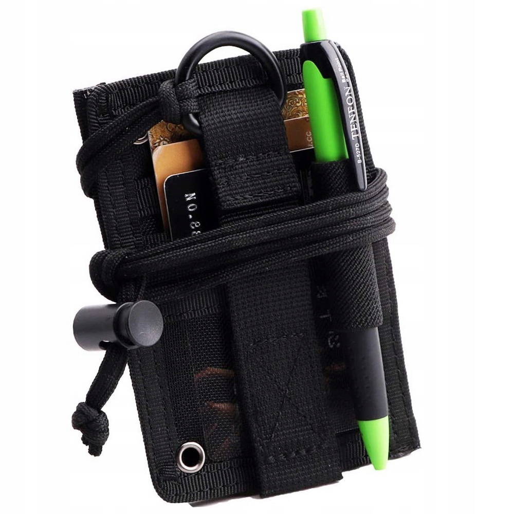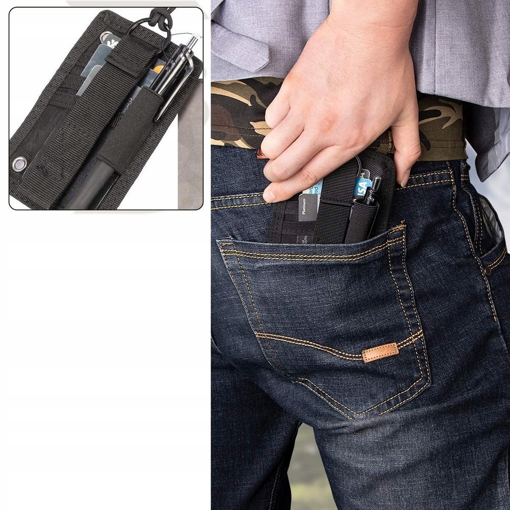 - Сзади есть 3 кармана для карточек, резиновый держатель для ручек и держатель на липучке, который позволяет прикрепить к ремню или системе Molle/Pals