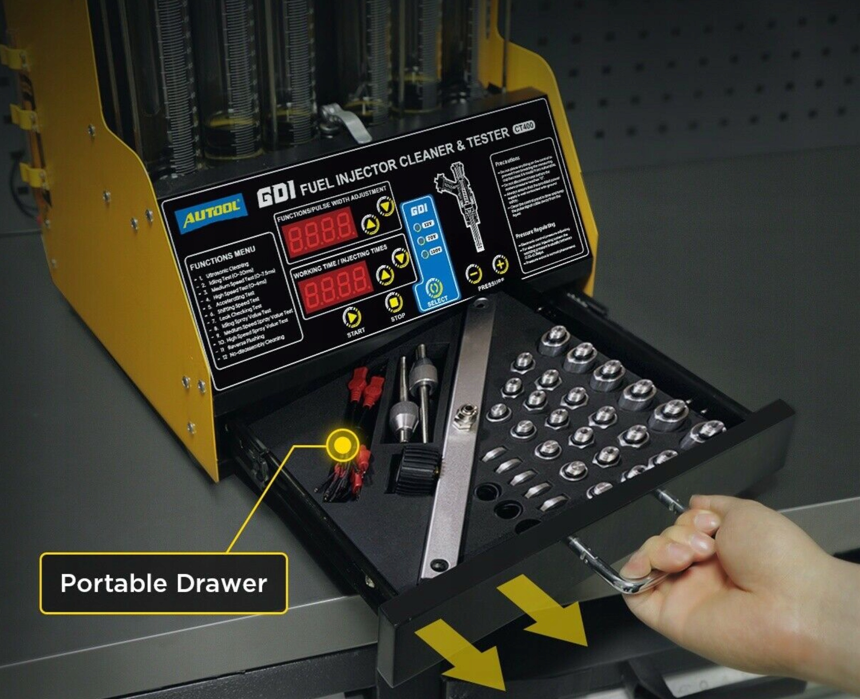 Все машины для очистки инжекторов AUTOOL имеют встроенный корпус, сочетающий в себе ванну ультразвуковой очистки и функцию тестирования. Модели CVT400 оснащены выдвижными ящиками для удобного хранения аксессуаров