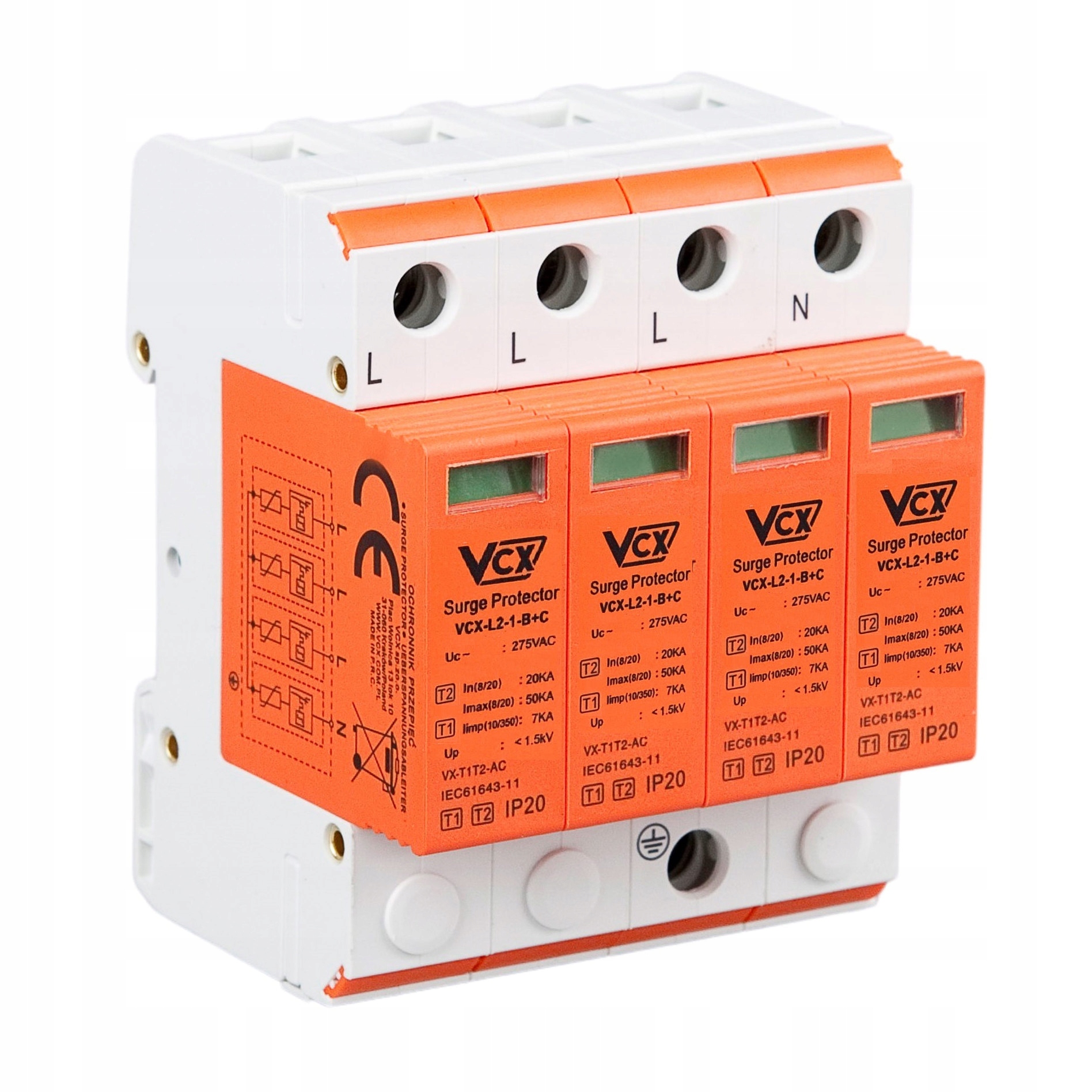 Модульные защитники VCX-L2-BC класса T1 T2. Их следует использовать в качестве первой и второй степени защиты в двух стадиях, подражателях. Защитники должны быть установлены в местах введения электрической установки в здание. Они обеспечивают полную защиту электрической установки и электрических устройств, питаемых от нее до работы тока молнии и других типов всплесков. Они уменьшают перенапряжения и приносят ударные токи на землю от обоих типов всплесков - прямых и косвенных. В то же время они обеспечивают двухэтапный уровень защиты. Использование модульных защитников Surge Protectors VCX-B+C T1T2 не требует использования продажи дросселей. Они обеспечивают эффективную защиту компьютеров, RTV/бытовых приборов и т. Д.