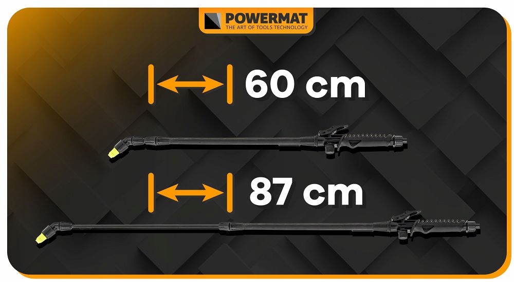 Опрыскиватель оснащен телескопической насадкой с регулируемой длиной от 60 см до 87 см, что позволяет комфортно работать как на ближней, так и на дальней дистанции. Благодаря этой функции пользователь может точно дозировать средство даже в труднодоступных местах, сохраняя при этом безопасное расстояние от распыляемой поверхности.