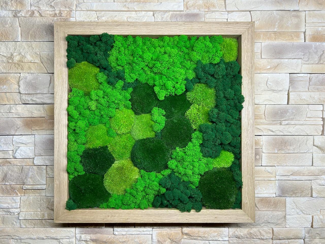 Каркас покрывается тонким слоем древесины выбранного цвета и фактуры. Шпон – натуральный материал, который подчеркивает эстетическую ценность картины из мха, добавляя ей теплоты и элегантности.