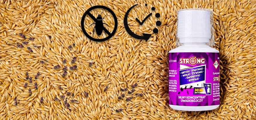 Препарат против вредителей зерна является незаменимым средством в предотвращении нападения древоточцев, комаров-вредителей, зерновых долгоносиков, насекомых хлебного дерева, которые способны уничтожать хранимое зерновое сырье и продукты переработки, такие как: < б>мука, макароны, рис, крупа или овсянка. Препарат от складских вредителей следует применять с большой осторожностью во избежание распыления его непосредственно на сырье и пищевые продукты. СТРОНГ – средство от складских вредителей, которое следует распылять на зараженные поверхности после уборки зерновых, продовольственных и табачных складов и удаления пищевых продуктов. Рекомендуется изолировать места хранения продукции и обеспечить безопасность сырья и продуктов питания во избежание возможного загрязнения.