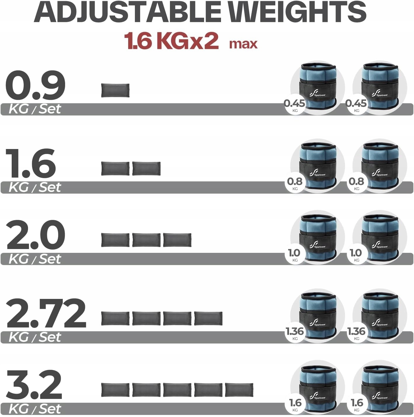 - Общая регулировка веса: 0,45–3,2 кг (пара).