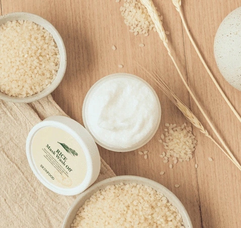 рис в составе косметики использовался на протяжении многих веков и до сих пор не потерял свою популярность. Он содержит много калия, а также фосфора, кальция, железа и йода, 8 наиболее важных аминокислот и витаминов группы В. Благодаря этим и другим биологически активным веществам, рис оказывает полезное влияние на кожу. Очищающая маска с рисом идеально очищает кожу мертвых клеток и кожного сала, осторожно полирует поверхность кожи, не повреждая ее. Он обладает глубоким питательным эффектом, защищает кожу от потери влаги, смягчает и сглаживает, а также помогает выравнивать тон кожи, осветляя обесцвечивание.