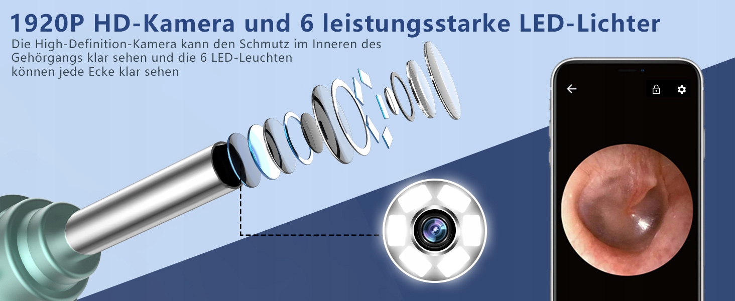 Отоскоп использует пиксели с высоким разрешением 1920p и линзу ширины 360 °, создавая более широкое поле зрения. Отоскопическая камера явно видит внутреннюю часть ушного канала, помогая очищать ушной канал без необходимости регулярно посещать врача. Камера EARR беспроводно подключена Wi-Fi, что позволяет предварительно просмотреть ушной канал на мобильном телефоне, сделать скриншоты и записи.