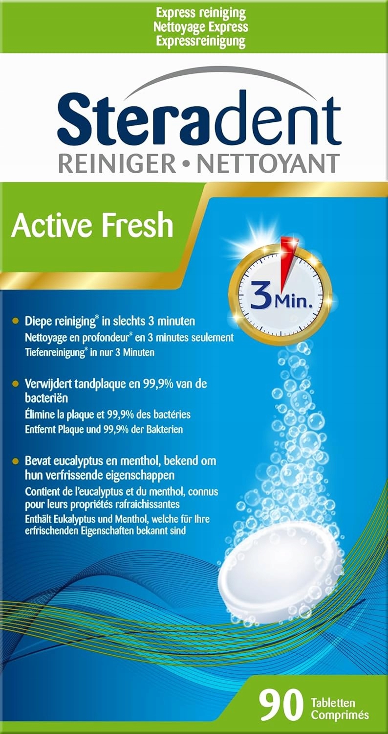 <р> Устраняет налет и бактерии на зубном протезе <р> Содержит эвкалипт и ментол, известные своими освежающими свойствами. <р> Мощная и тщательная очистка, удаляя налеты и загрязнения, с которыми не может справиться зубная щетка <р> Подходит для полных и частичных устройств. Рисунок не представляет угрозы для металлических деталейНазвание продукта: Очиститель Steradent Active Fresh X90