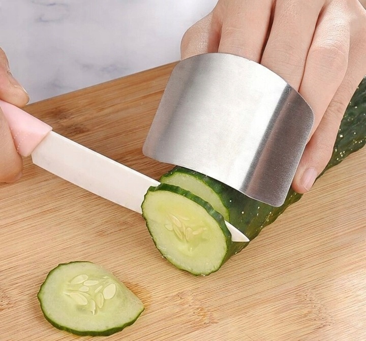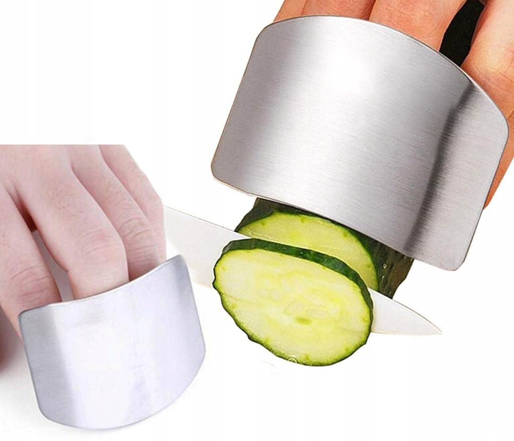 Защищает пальцы при нарезке продуктов. Защитник должен быть установлен на палец и начать резать, изделие следует придерживать рукой с надетым на него протектором, а затем разрезать по краю. Изготовлено из стали, поэтому есть нет страха порезаться самому, очень полезно на кухне.