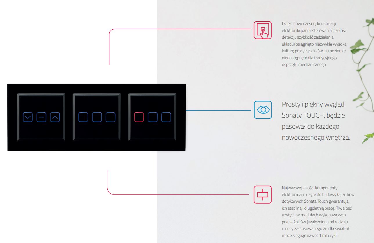 Возможность настроить любые сенсорные разъемы, также с другими серийными продуктами, во всех кадрах серии Sonata. Модульный дизайн соединителей Sonata Touch позволяет настроить со всеми продуктами серии Sonata в два -пять раз, что означает, что это практически первая такая серия на польском рынке. Касание разъемов разумно подключены к разъемам заглушек, регулятору температуры или обнаружению