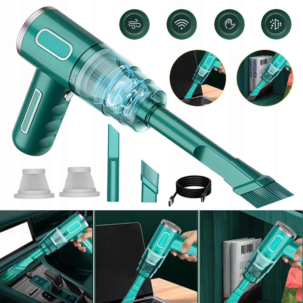 Мини-пылесос изготовлен из высококачественного АБС-материала, прочного и легкого. Встроенный фильтр и пылесборник пылесоса снимаются и могут использоваться повторно, что упрощает обслуживание. Прозрачный контейнер для пыли поможет вам узнать, когда его опорожнить. Беспроводная конструкция позволяет легко носить с собой беспроводной пылесос, с ним легко чистить машину, дом и офис.