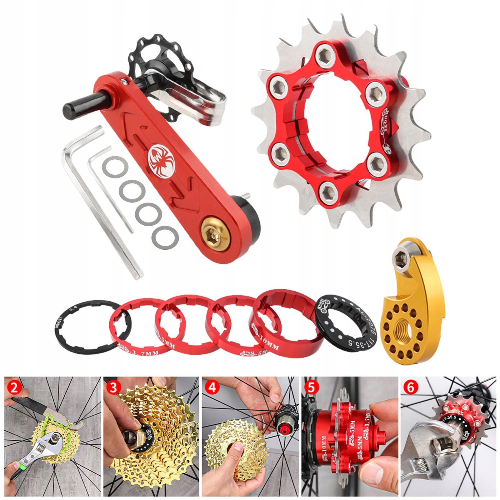 [В комплект входит]: 1 натяжитель цепи, 5 односкоростных прокладок с проставками, 2 гаечных ключа с проставками, 1 односкоростная кассета и 1 регулятор.