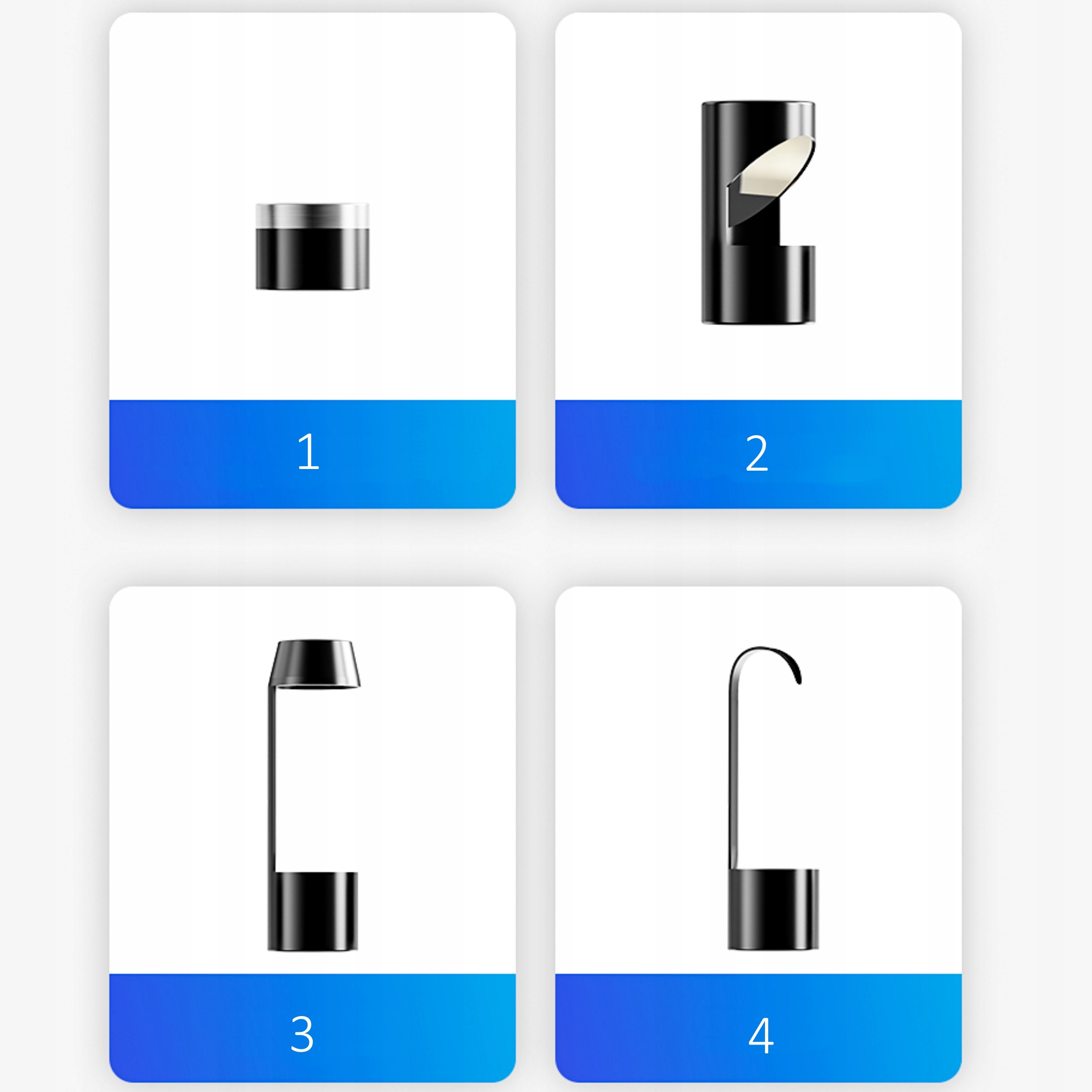 В комплект входят четыре накладки. Первый представляет собой водонепроницаемую кепку, второй заканчивается боковым зеркалом, третий имеет магнит и четвертый имеет крючок. Они увеличивают область действия эндоскопа. Они будут особенно полезны при необходимости вынести вещь из мест, недоступных для человека - в экстренных ситуациях, когда, например: