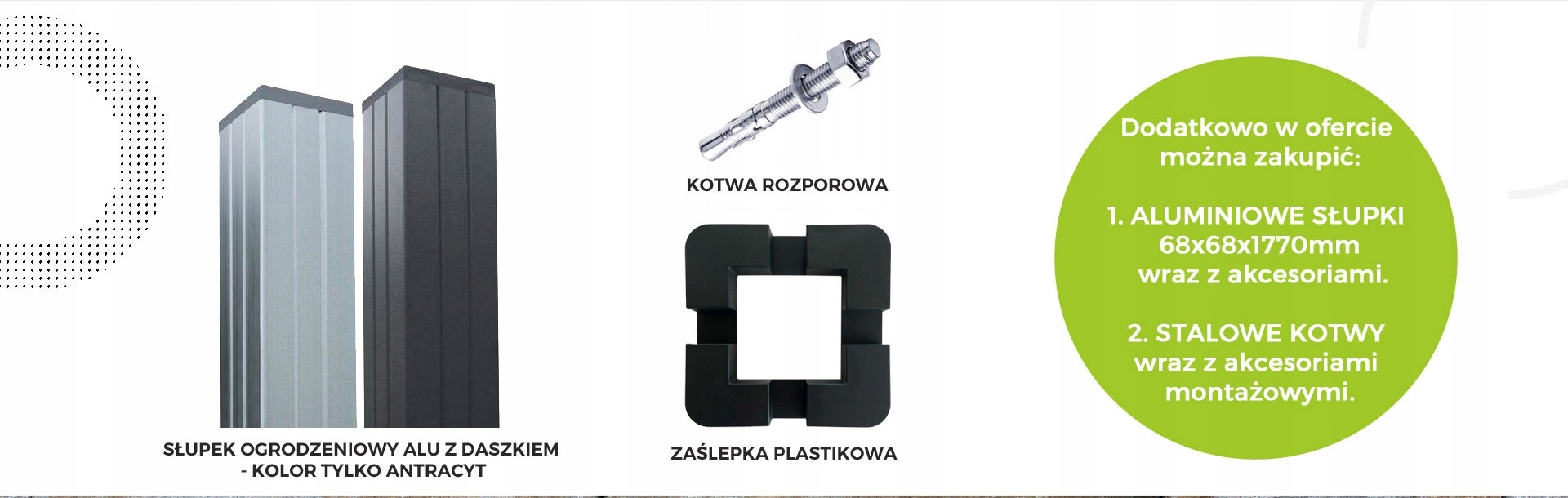 <р>1. АЛЮМИНИЕВЫЕ СТОЙКИ 68х68х1770мм с фурнитурой. <р>2. СТАЛЬНЫЕ АНКЕРЫ с монтажными принадлежностями.Заборы в наличии сразу, в большом количестве, сроки выполнения заказа исключительно логистические вопросы или на месте на складе в Радоме на постоянной основе. Спросите об установке забора нашими опытными бригадами монтажников.