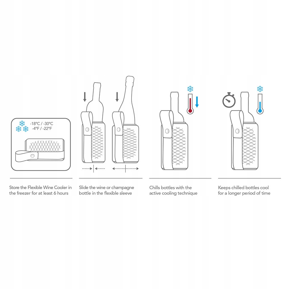 Храните холодильник для вина в морозильной камере не менее 6 часов . Вставьте бутылку вина или шампанского в рукав, ледяные охлаждающие элементы внутри непосредственно контактируют с бутылкой, обеспечивая оптимальный охлаждающий эффект.