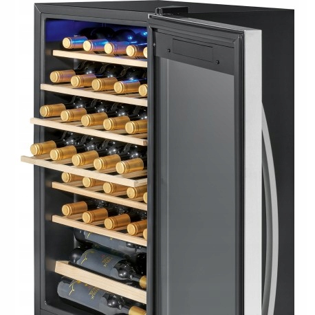 Объем холодильника — 95 литров. Семь уровней и шесть эстетичных деревянных полок вместят до 36 бутылок вина емкостью 0,75 л .