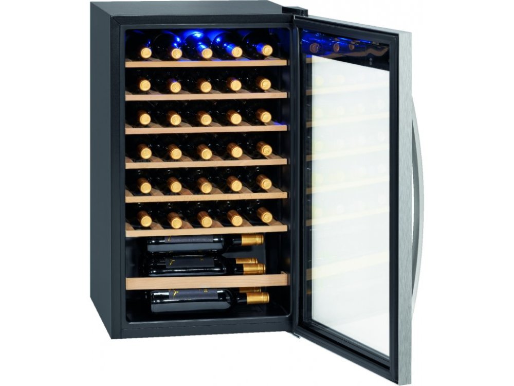 Большой винный погреб общей емкостью до 95 литров и местом для 36 бутылок по 0,75 литра. Застекленное прозрачное изголовье кровати, внутреннее освещение и деревянные полки делают его идеальным дополнением элегантной кухни, гостиничного номера или бара. Устройство имеет регулируемую температуру охлаждения в диапазоне от +4 до +18°С