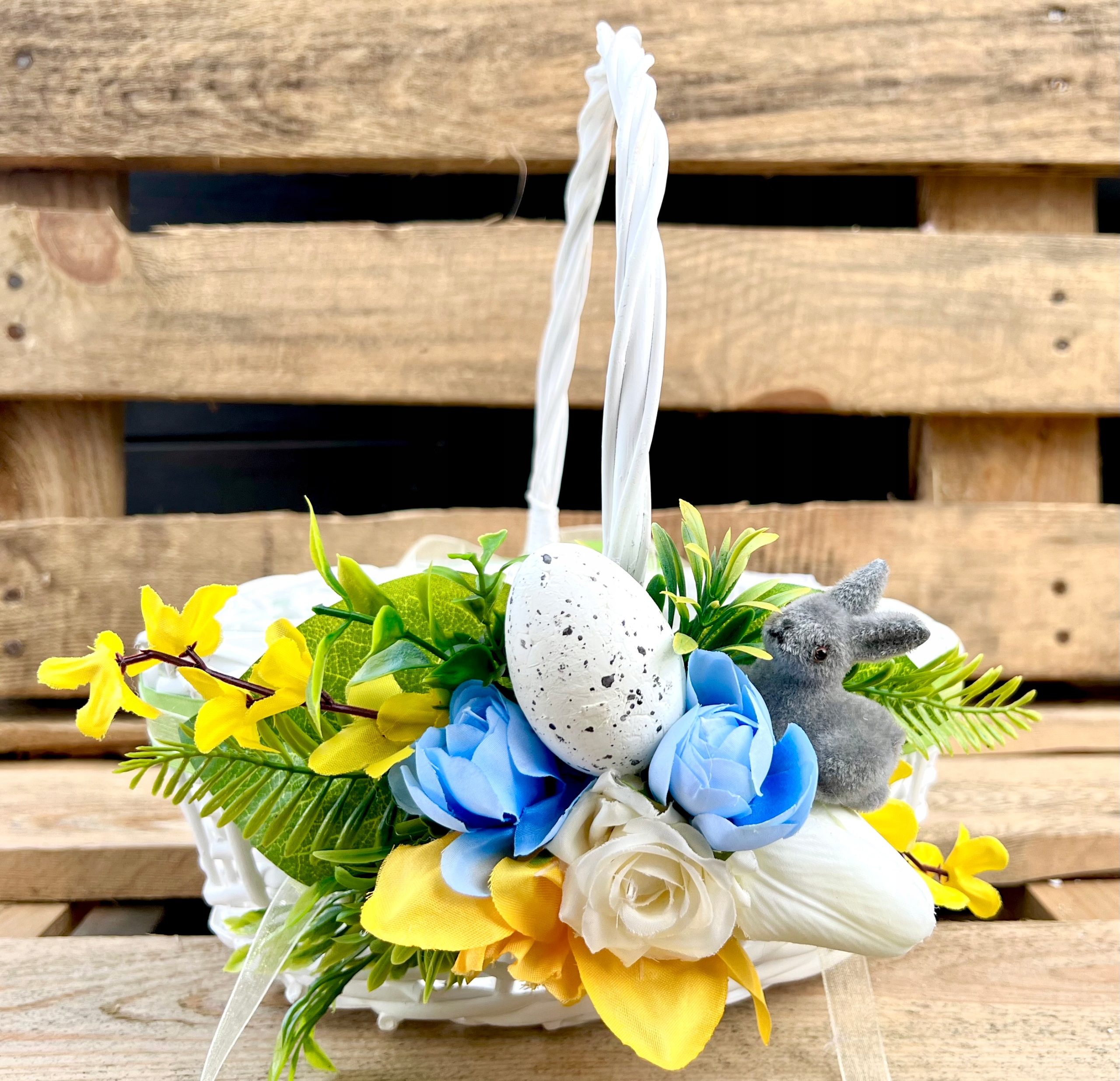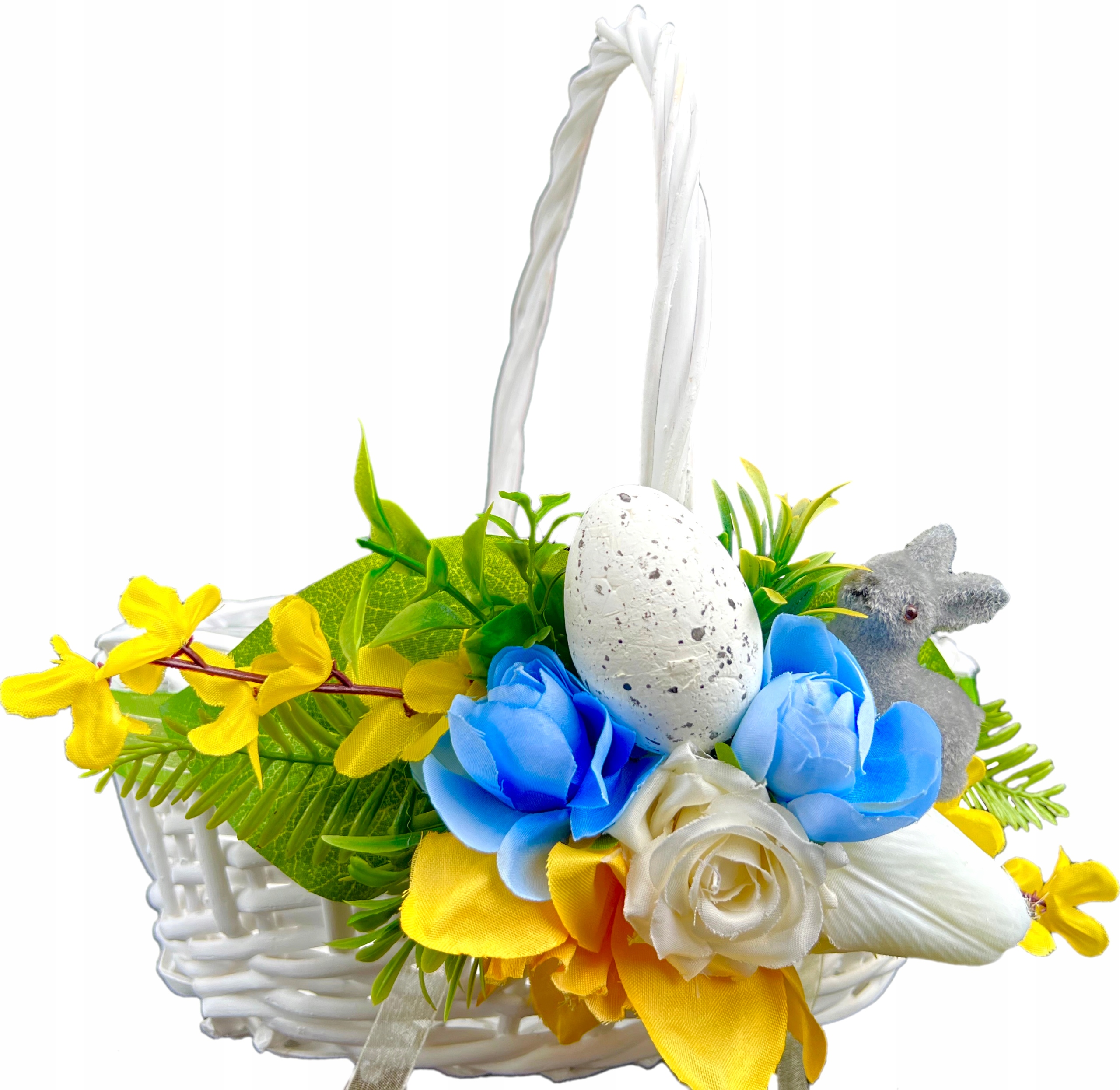 - в оформление входят зеленые аксессуары, цветы, пенопластовые яйца, серый флокированный зайчик, ленты,