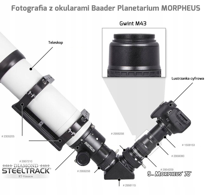 Очки Baader Morpheus не только оптически совершенны. Их корпус также усовершенствован, он является водонепроницаемым и оптимизирован для легкости и удобства использования в насадках для бино. Очки всей серии парфокальные. Они оснащены резьбой М43, что позволяет подключать множество переходников для парфокальной и окулярной астрофотографии. Высочайшее качество изображения и большое расстояние выходного зрачка в сочетании с множеством адаптеров в предложении Baader делают очки Morpheus непревзойденными в этом отношении.