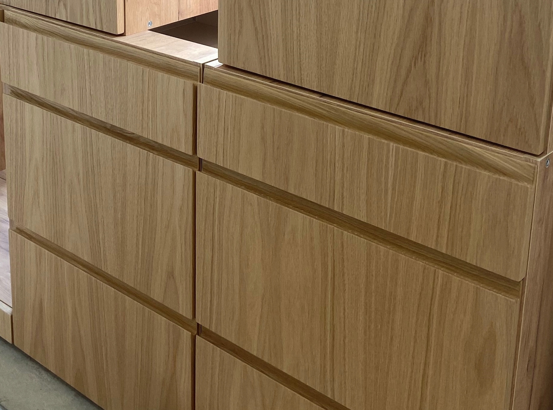 Современные шпонированные фасады изготавливаются из ДСП толщиной 19 мм, отделанных шпоном дуба. Рисунок зерен может быть прямым или с гладким рисунком. Дополнительно края отделаны шпоном толщиной 1,5 мм. Возможна вертикальная или горизонтальная зернистость (максимум 2,5 м).