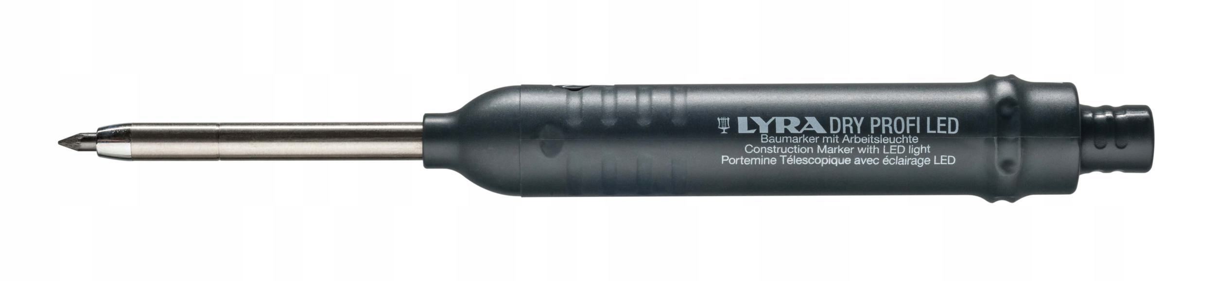 Lyra Dry Profi LED — простой маркер со светодиодной лампой, который пригодится при работе в плохо освещенных местах. В комплект входят батарейки-таблетки для освещения LR41 – 3 штуки. Карандаш помогает во всех строительных, строительных, столярных, монтажных и обустройство дома работах. Он оснащен автоматическим механизмом выброса вкладыша после нажатия кнопки на его верхней части. Благодаря этому им легко пользоваться даже одной рукой. Этот маркер также имеет встроенную точилку, расположенную в кобуре. LYRA оснастила модель DRY PROFI аккуратным чехлом с клипсой, которую можно прикрепить к брюкам или ремню.