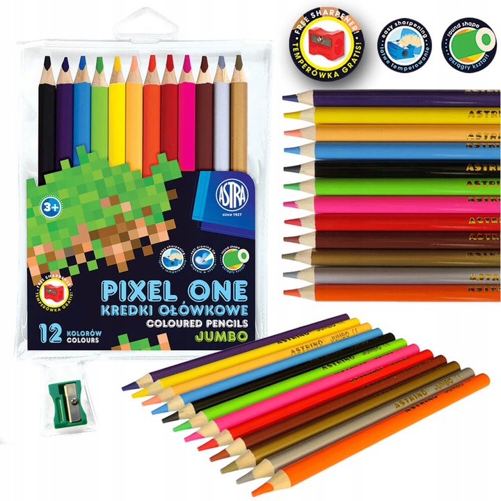 <ул>Толстые большие карандаши Astra Kids для детей. 12 цветных карандашей круглого сечения в упаковке с пикселями в стиле известной компьютерной игры. Мелки ASTRA мягкие в использовании, обеспечивают насыщенные цвета и легко затачиваются. Благодаря толстой форме его легче держать в руке ребенка. Точилка входит в комплект бесплатно.