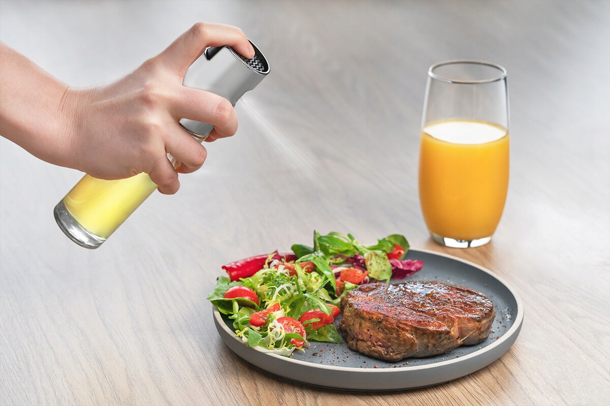 С помощью распылителя мы распыляем масло на продукты в виде мелкого тумана, благодаря чему оно распределяется равномерно, что позволяет контролировать его количество и снижать калорийность. А еще это очень экономично – расход масла в несколько раз ниже.