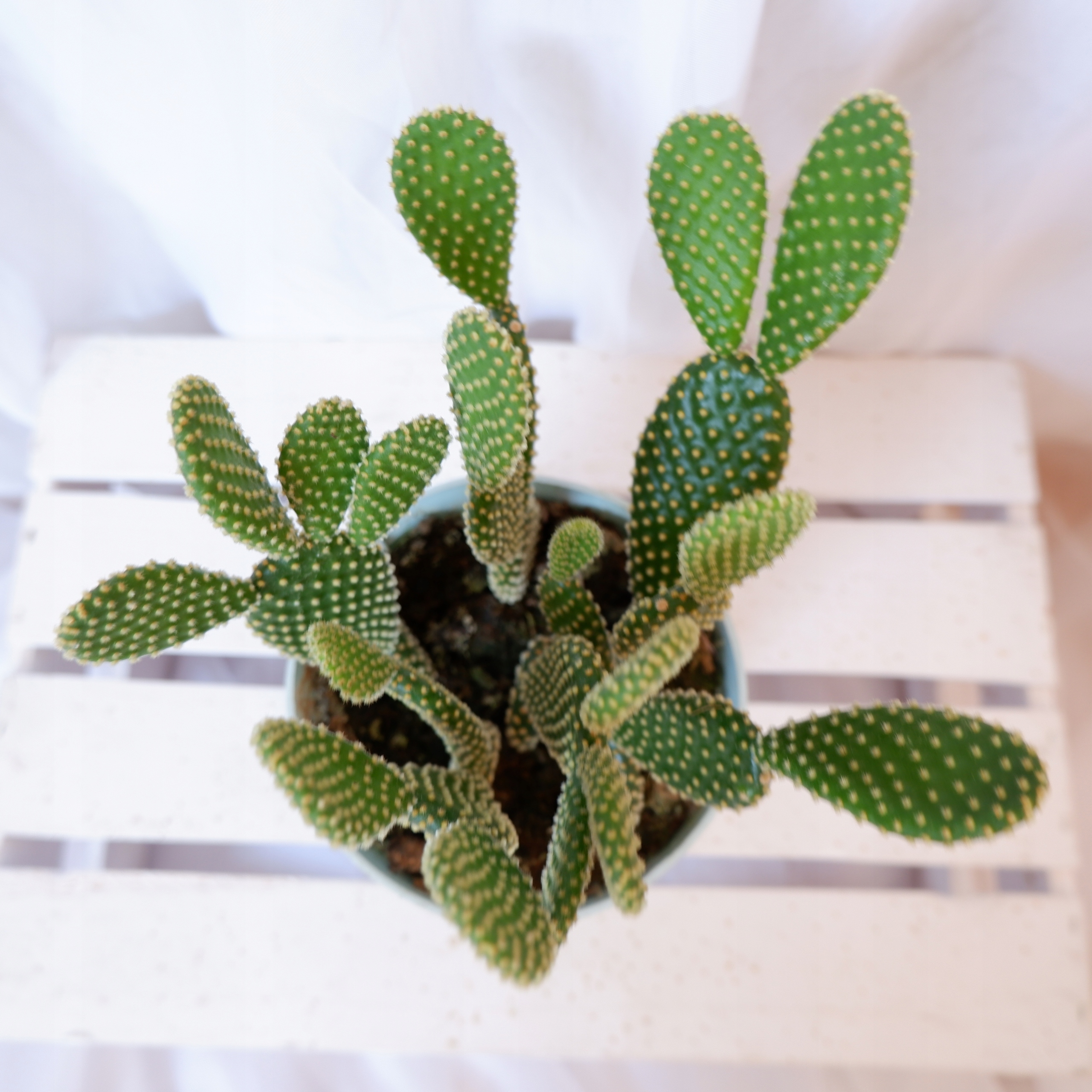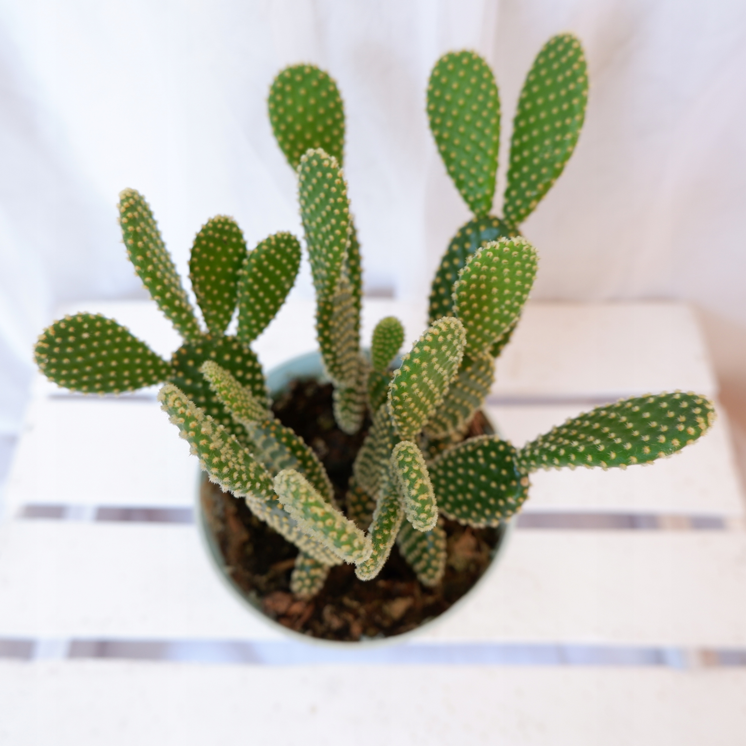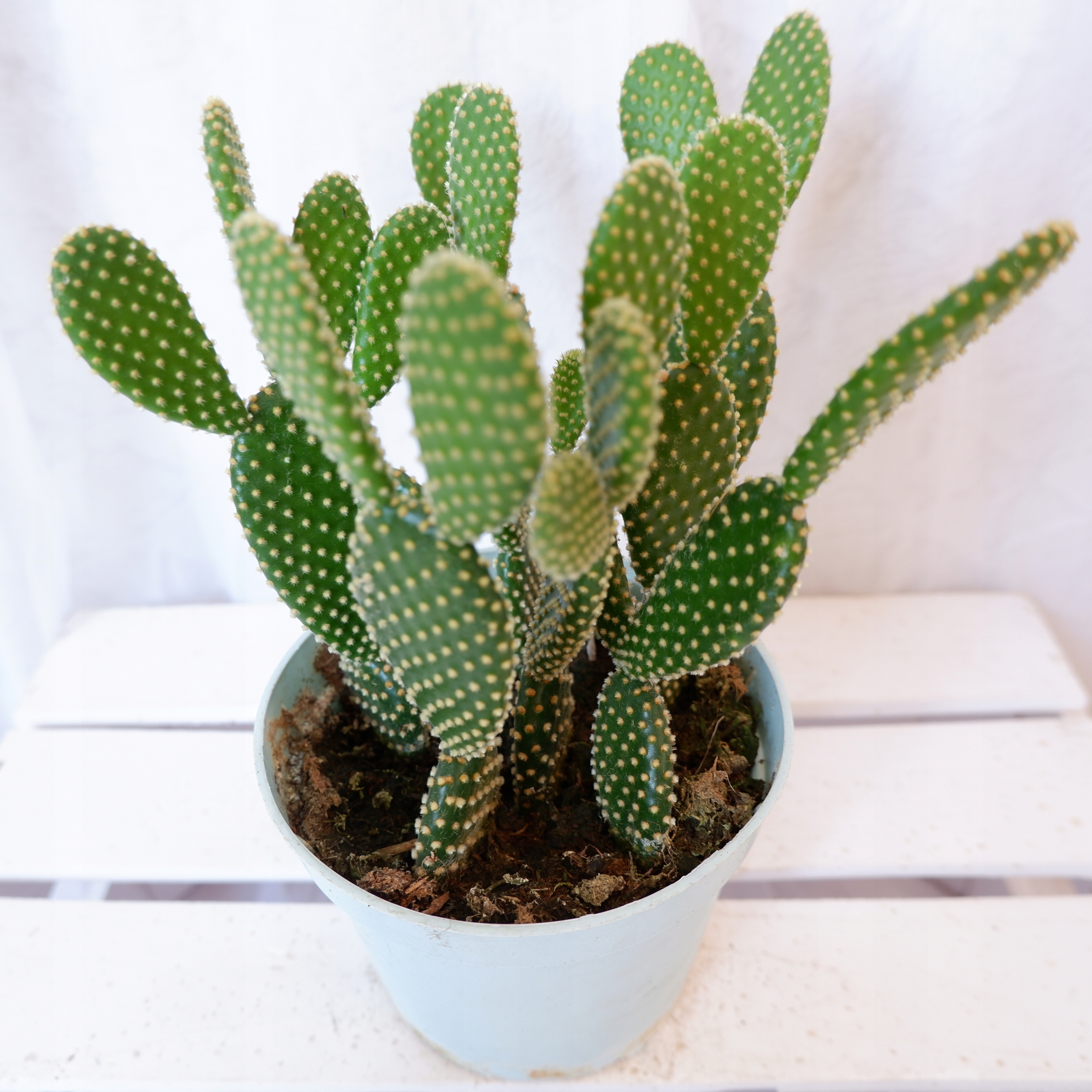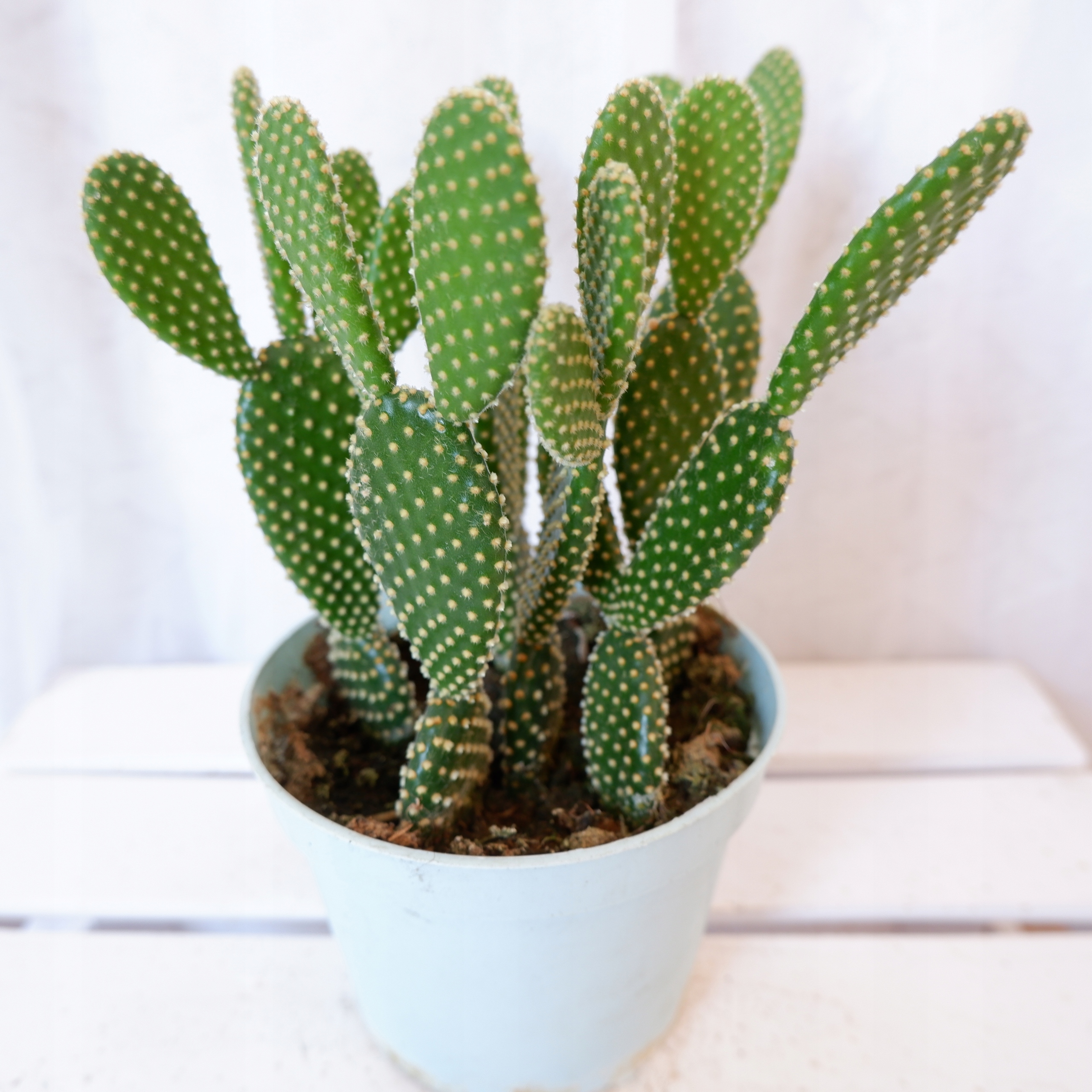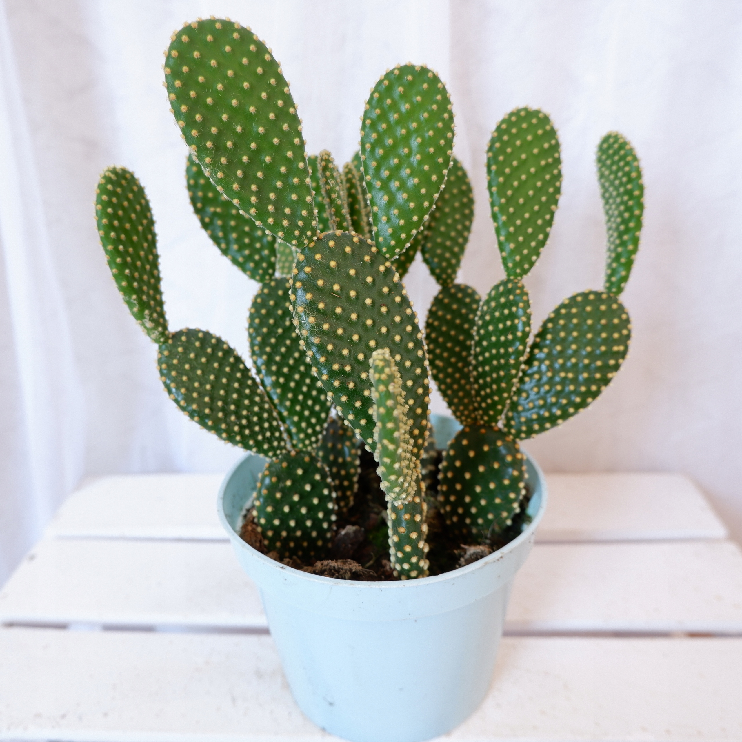 В конечном итоге вырастает в виде густого кустарника высотой около 40-60 см. Зеленые, скрученные побеги создают удивительные композиции. Их поверхность украшена желтыми, похожими на волоски, маленькими, плотно прилегающими глохидами, окраска которых гармонирует со всем остальным.