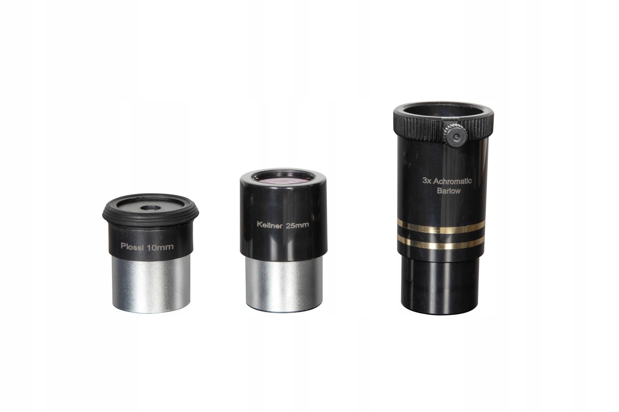 В комплект телескопа входят все самые важные инструменты, необходимые для космических наблюдений – в комплект входят окуляр КФ 25 мм и окуляр ПФ 10 мм. Производитель также включил дополнительные аксессуары, причем отдельного упоминания заслуживает линза Барлоу, ведь с ее помощью можно увеличить увеличение вашего телескопа в три раза. Это не единственный элемент, который вы можете заменить в телескопе и таким образом повлиять на его параметры. Прибор совместим со стандартными компонентами размером 1,25 дюйма, поэтому к нему можно устанавливать элементы от более крупных и дорогих телескопов. Вместе с телескопом Opticon Orbiter вы также получаете карты неба, книгу «След звезд», 3D-очки, гиды, а также полную двухлетнюю гарантию производителя.