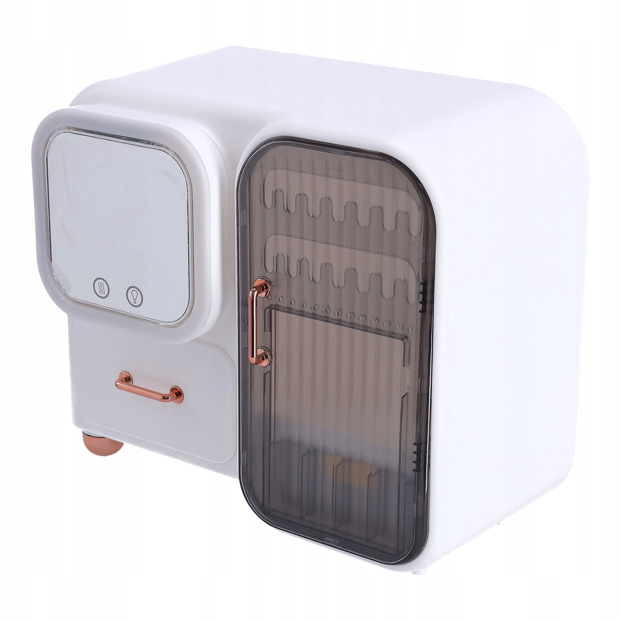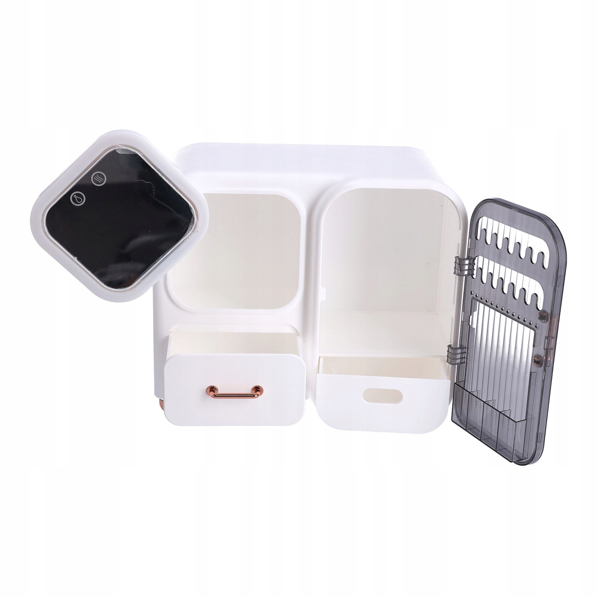 В органайзере также есть зеркало, поэтому вы можете наносить макияж где угодно. Зеркало оснащено светодиодной подсветкой с тремя световыми эффектами: теплый, естественный, холодный свет. Зеркало поворачивается вправо, а за зеркалом также имеется отделение, в котором можно хранить, например, вещи. кремы. Зеркало также оснащено вентилятором, что позволяет макияжу быстрее высохнуть после нанесения макияжа.