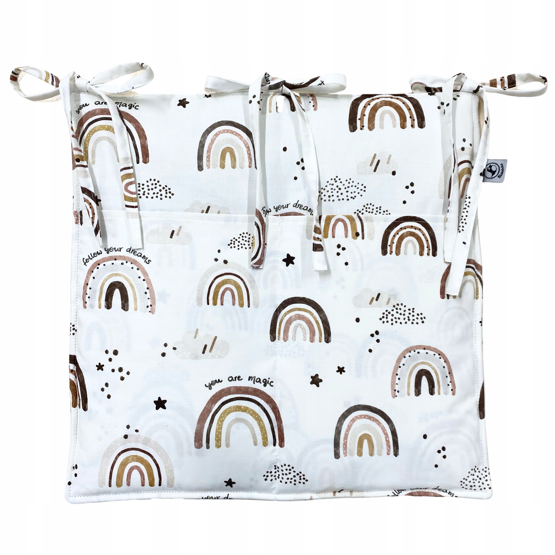Хлопковый органайзер для детской кроватки, кровати или пеленального столика. Это облегчает повседневный уход за ребенком во время смены подгузников или купания. Имеет два больших кармана, в которые можно положить самые необходимые гигиенические принадлежности, например, подгузники, влажные салфетки или уходовую косметику. Изготовлен из хлопка, с мягким антиаллергенным утеплителем внутри, практичная трехструнная застежка предотвращает падение и соскальзывание органайзера. Возможна комплектация всего комплекта к кровати по этой схеме.