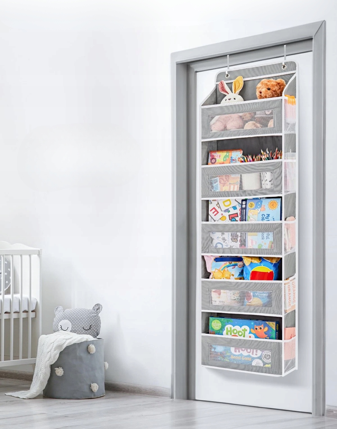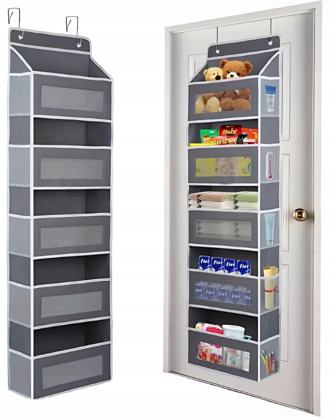Простая установка - Организатор, подвешенный с двумя металлическими крючками. Набор также включает в себя вставки жесткости, покрытые материалом, которые обеспечивают стабильность полок.