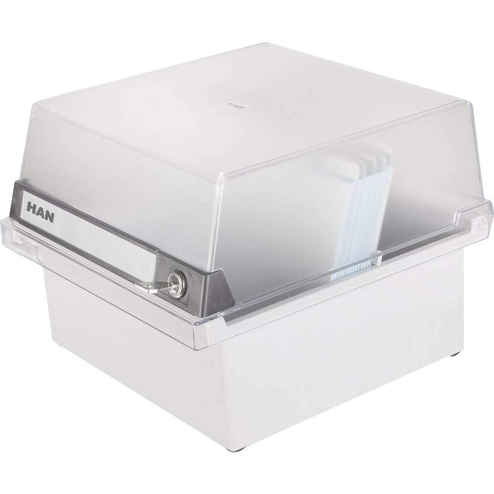 <р> HAN 965-S-631, СПЕЦИАЛЬНАЯ ВЕРСИЯ Коробка для карточек формата А5, полупрозрачная/светло-серая <р> Высококачественная картотека HAN светло-серого цвета идеально подходит для хранения благодаря встроенному замку. <р> конфиденциальная информация. Система хранения также оснащена нескользящими резиновыми ножками, защищающими мебель, и большим <р> Поле описания, облегчающее ориентацию. <р> Подробности о товаре: *Артикульный номер: 965-S-631 <р> * Цвет стержня: светло-серый. <р> * Цвет крышки: прозрачный <р> * Коробка для карточек DIN A5, горизонтальная, на 800 карточек <р> * Большое поле описания. <р> * Противоскользящие резиновые ножки, защищающие мебель. <р> * Включая 1 опорную пластину и выдвижную лестницу <р> * Внешние размеры (ширина х глубина х высота): 234х250х180 мм <р> *Материал: высококачественный пластик PS <р> *Сделано в ЕСПараметры продукта