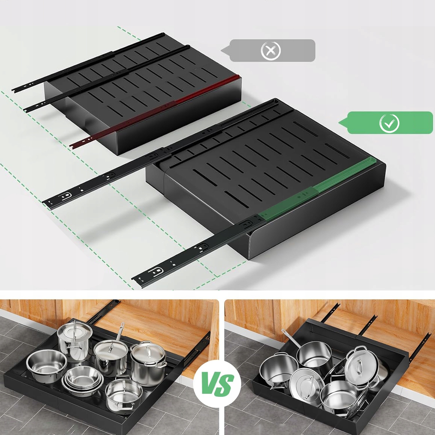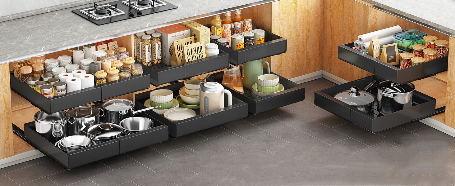 - Вы можете максимально использовать пространство в шкафах и иметь легкий доступ ко всем горшкам, сковородкам, небольшим кухонной посуде, чистящим средствам, джемам и другим продуктам.
