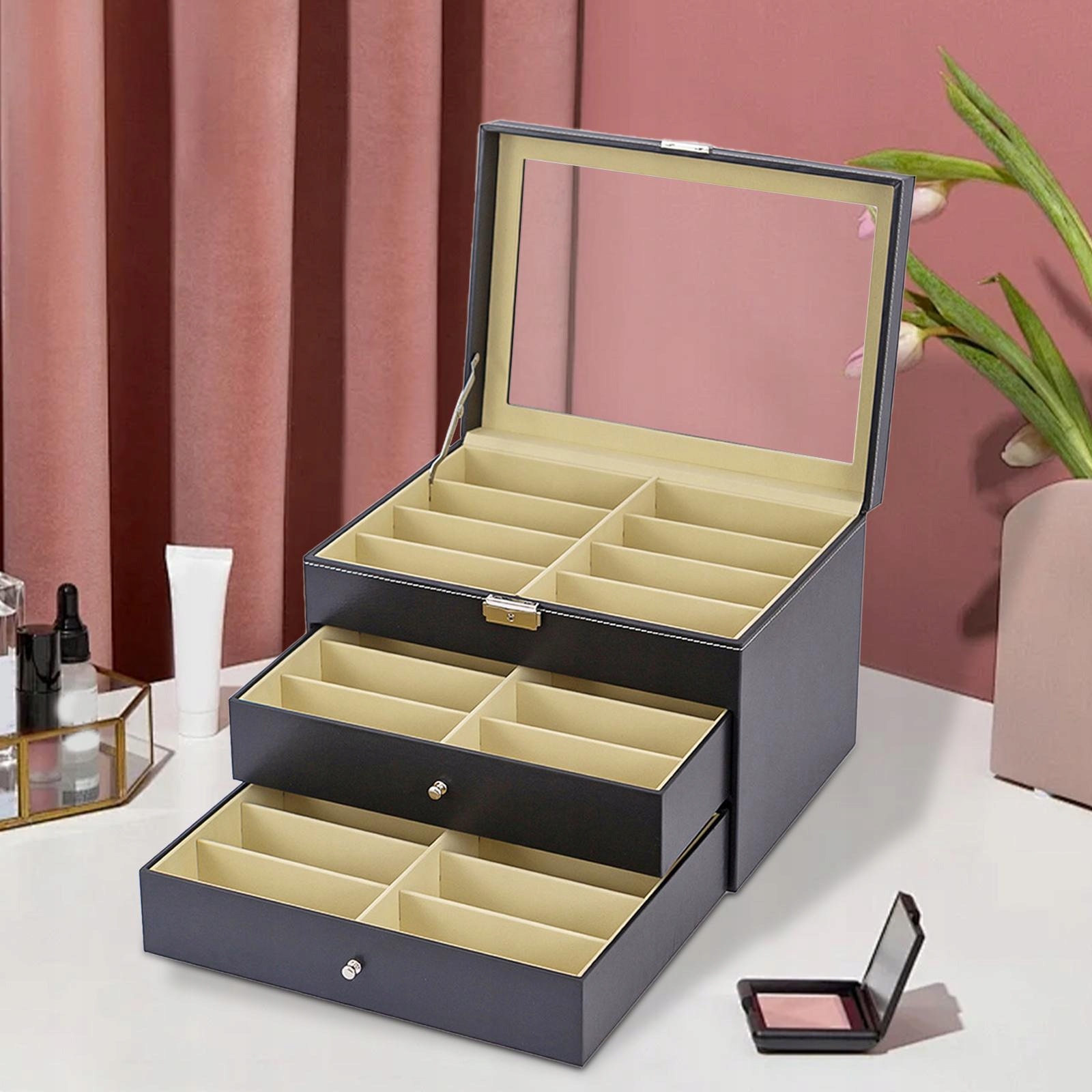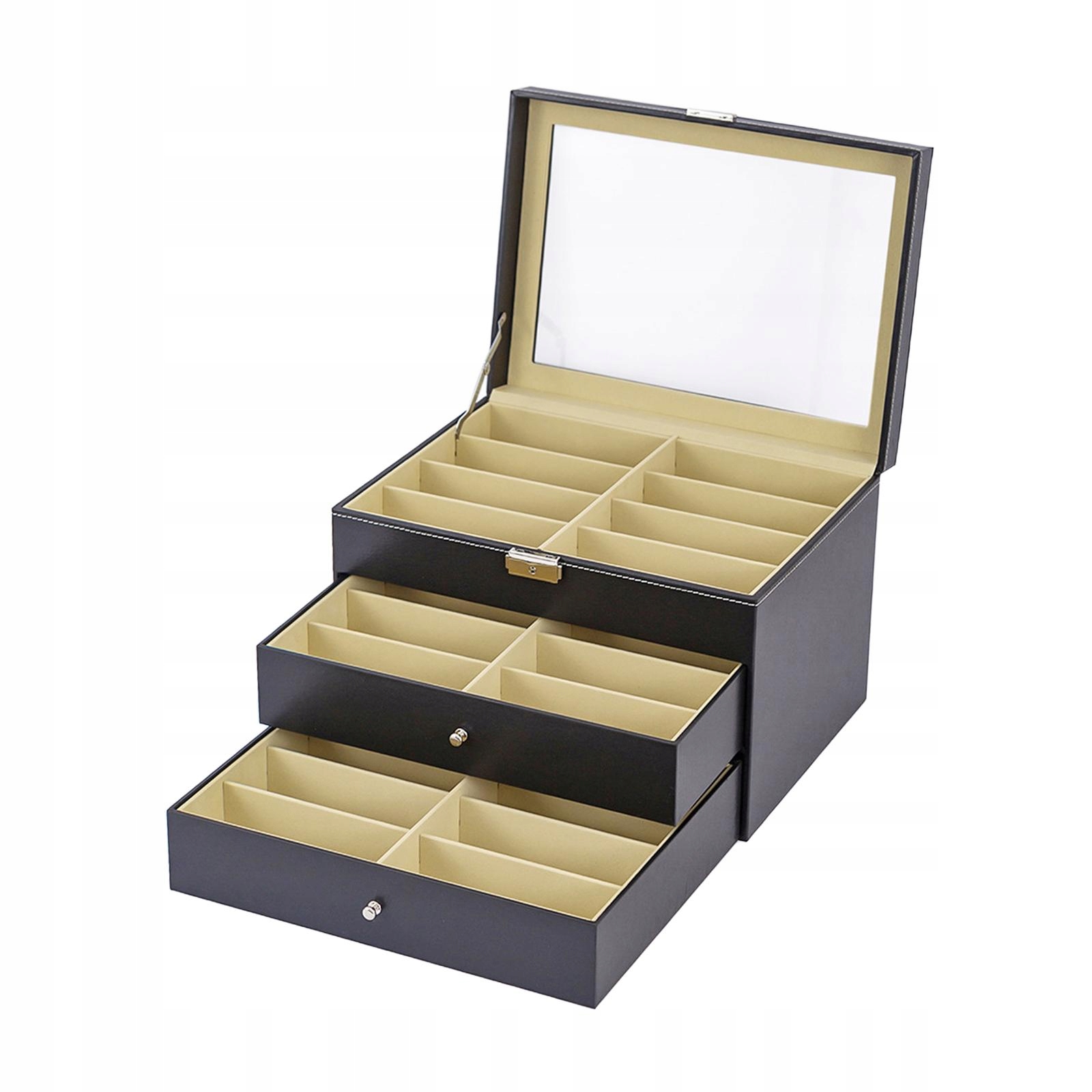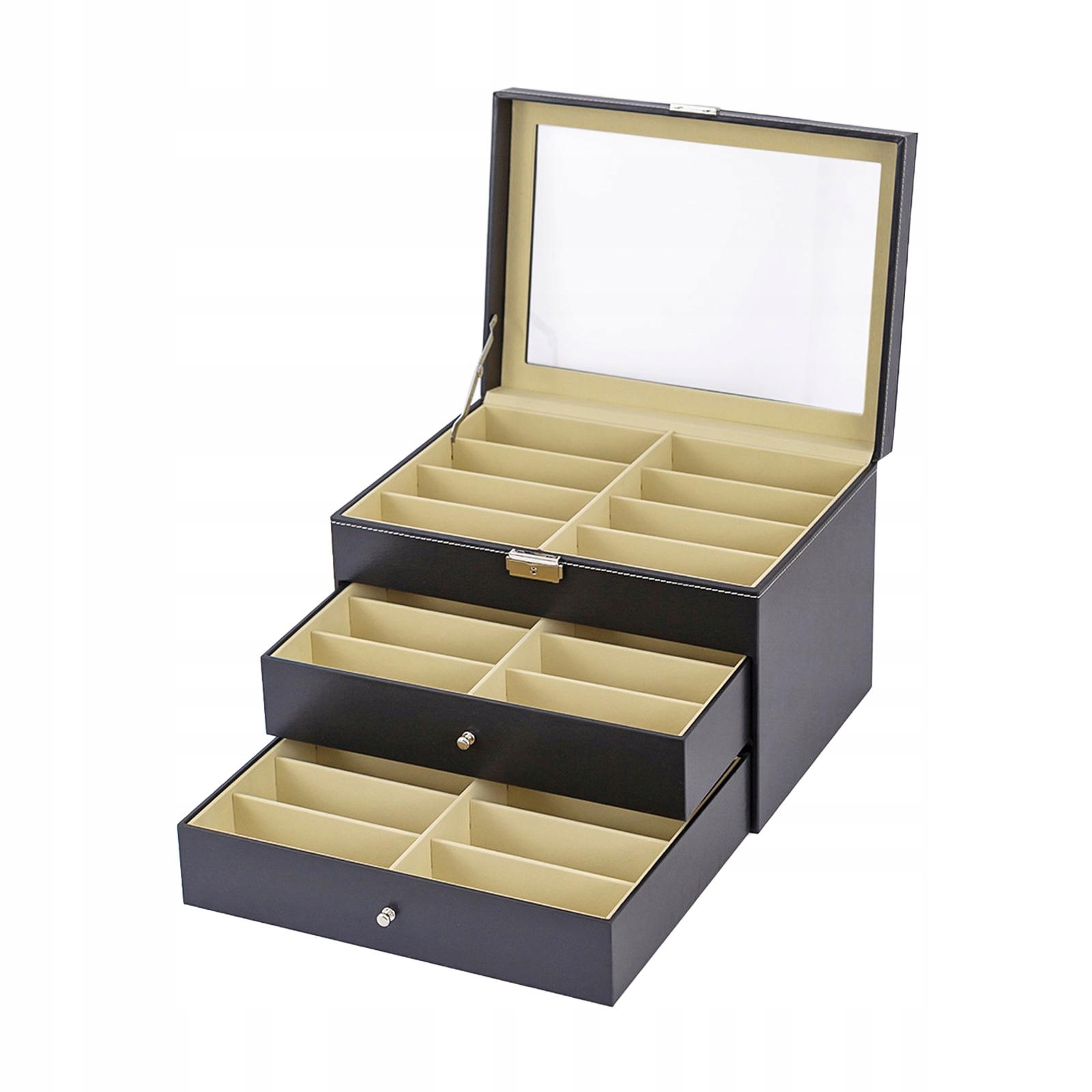 [Элегантное и организованное хранение]: Этот трехуровневый организатор очков был разработан для хранения и демонстрации разнообразной коллекции очков, включая солнцезащитные очки и ювелирные изделия. Его элегантный вид обеспечивает упорядоченное поддержание элементов, добавляя элегантность каждого пространства