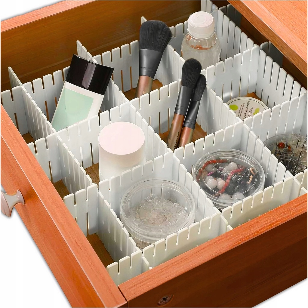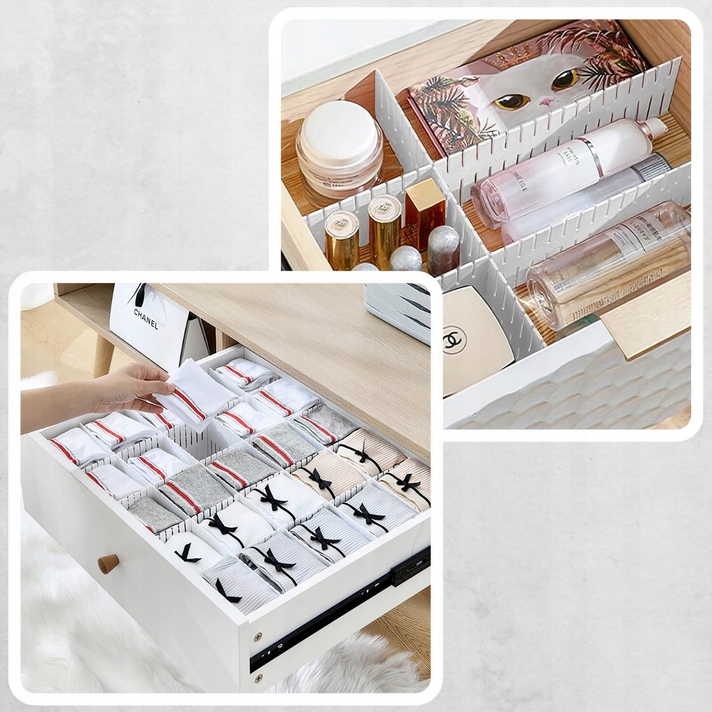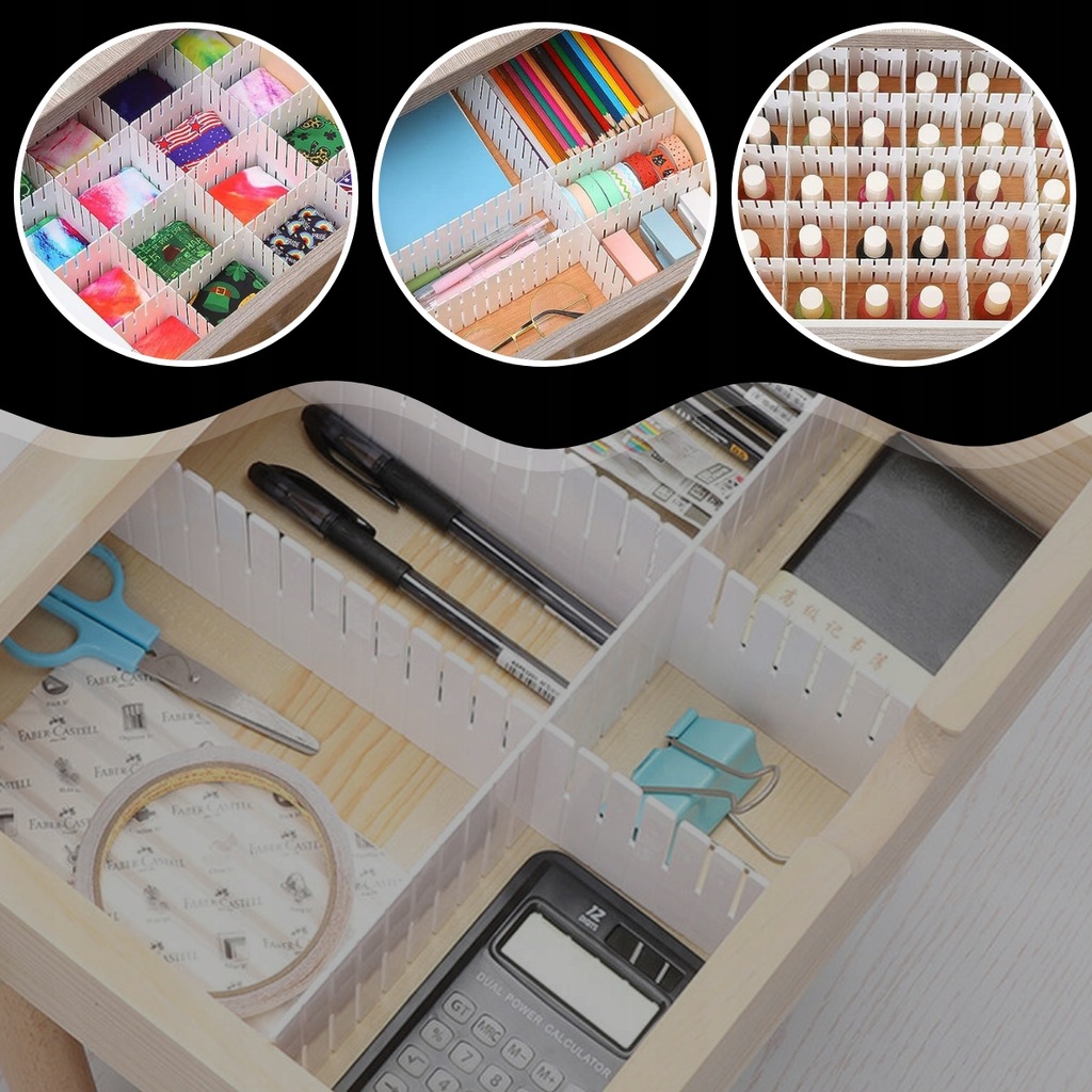 Разделители позволяют создать собственное расположение отсеков в ящике или шкафу. Благодаря возможности обрезать их до любой длины, вы можете легко подогнать их под размер мебели и тип хранящихся предметов: от нижнего белья и аксессуаров, косметики до небольших инструментов или канцелярских товаров. Сборка быстрая, простая и не требует использования клея или шурупов.