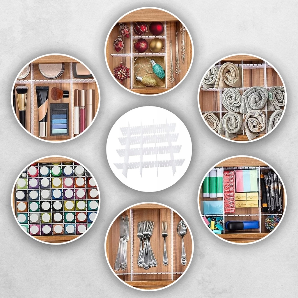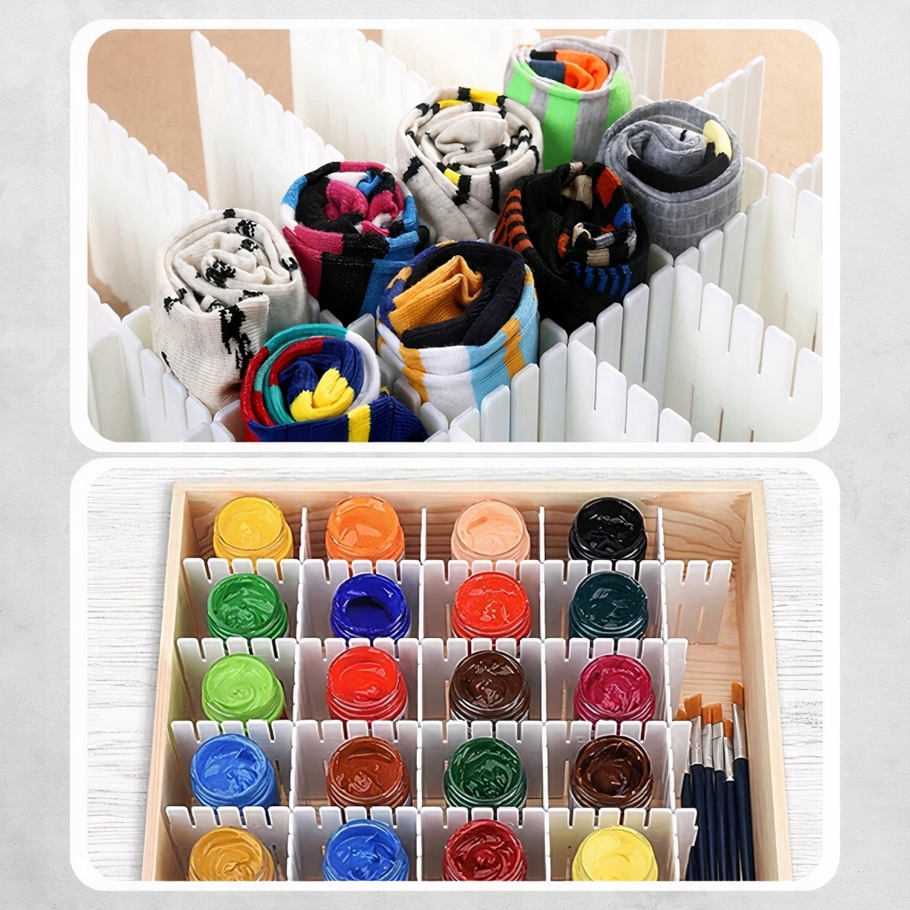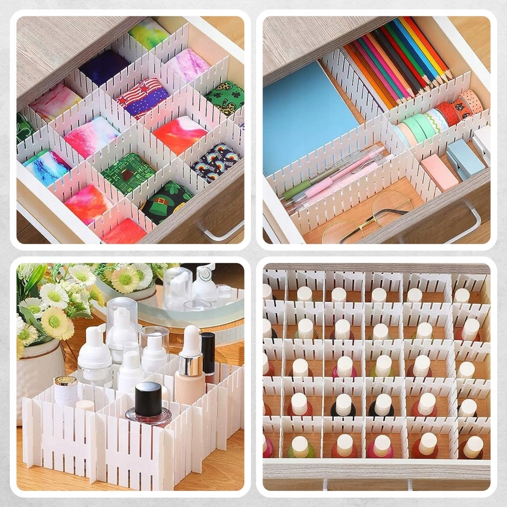 Разделители позволяют создать собственное расположение отсеков в ящике или шкафу. Благодаря возможности обрезать их до любой длины, вы можете легко подогнать их под размер мебели и тип хранящихся предметов: от нижнего белья и аксессуаров, косметики до небольших инструментов или канцелярских товаров. Сборка быстрая, простая и не требует использования клея или шурупов.