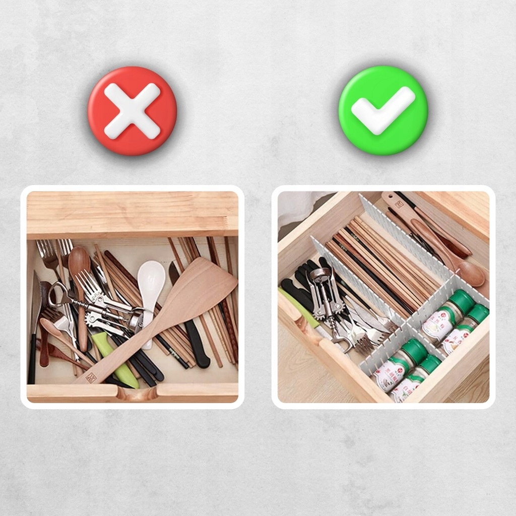 - Универсальное использование делает отсеки идеальными для кухонных ящиков, гардеробов, кабинетов, комодов или шкафов в ванной комнате, где важен порядок и хорошая организация.
