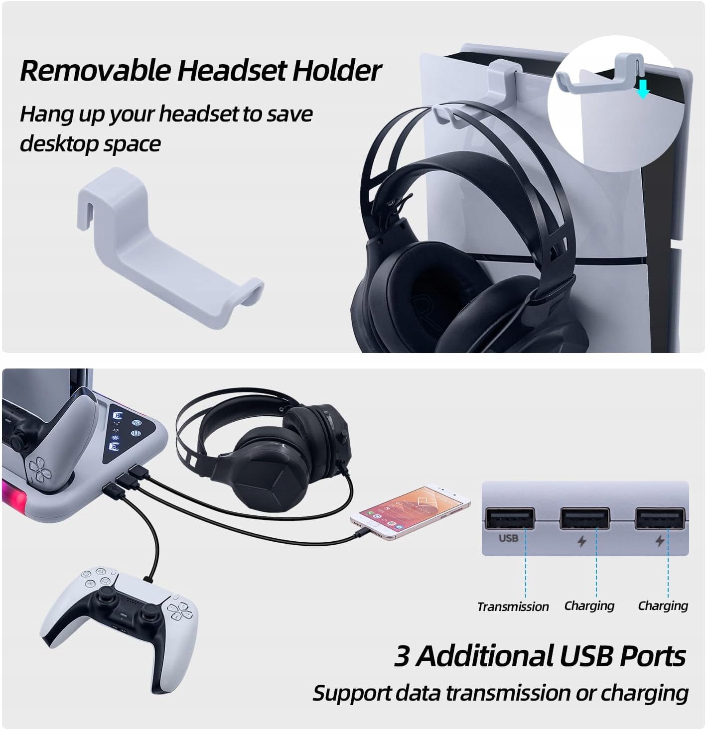 【Многофункциональность с дополнительными портами USB】Подставка не только охлаждает и заряжает, но и также расширяет возможности подключения консоли. Включает 3 порта USB, включая порт USB 2.0, разработанный специально для передачи данных, что расширяет функциональность консоли PS5.