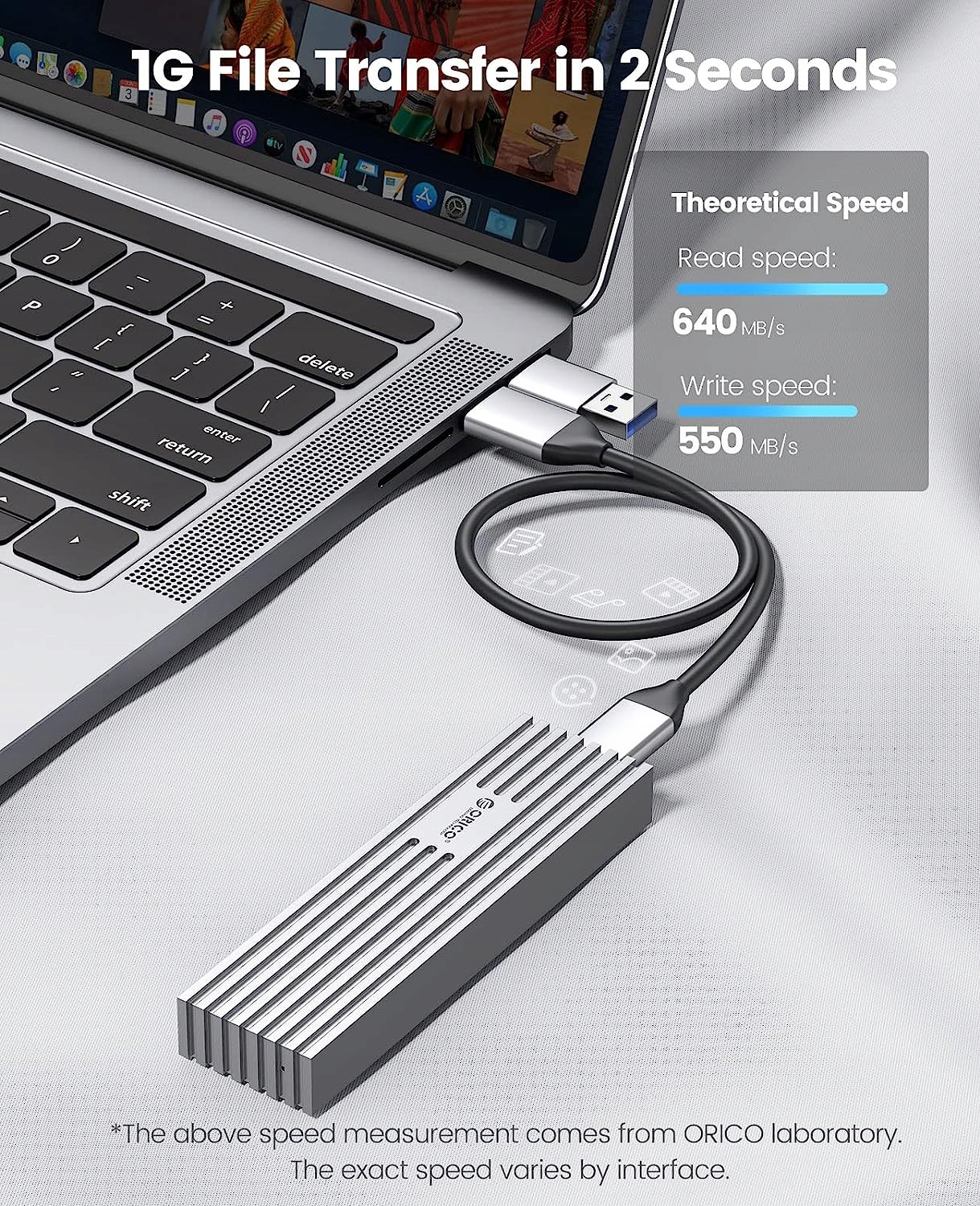 Скорость передачи данных корпуса M231 M.2 SATA составляет до 6 Гбит/с. После установки SSD M.2 SATA скорость чтения и записи может достигать 500–640 МБ/с. Идеальное решение для передачи и резервного копирования данных. Превратите свой неиспользуемый внутренний твердотельный накопитель в удобный внешний твердотельный накопитель.