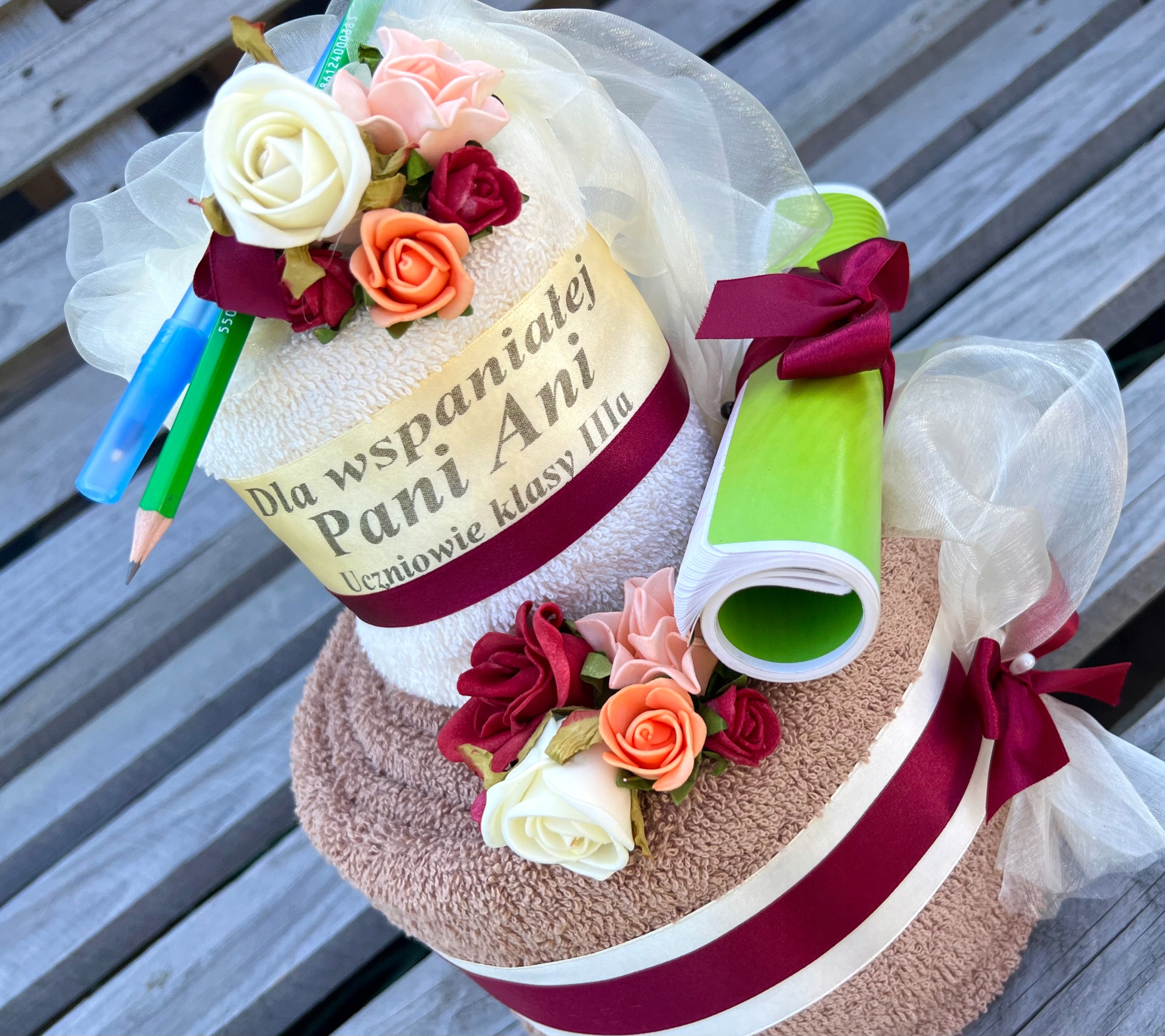 Торт из полотенец с посвящением на ленте – ваша индивидуальная надпись и школьные принадлежности – ХИТ этого года. Прекрасный подарок ко Дню учителя, окончанию учебного года, именинам или дню рождения любимого учителя или директора школы. Удивите каждого неповторимым подарком.